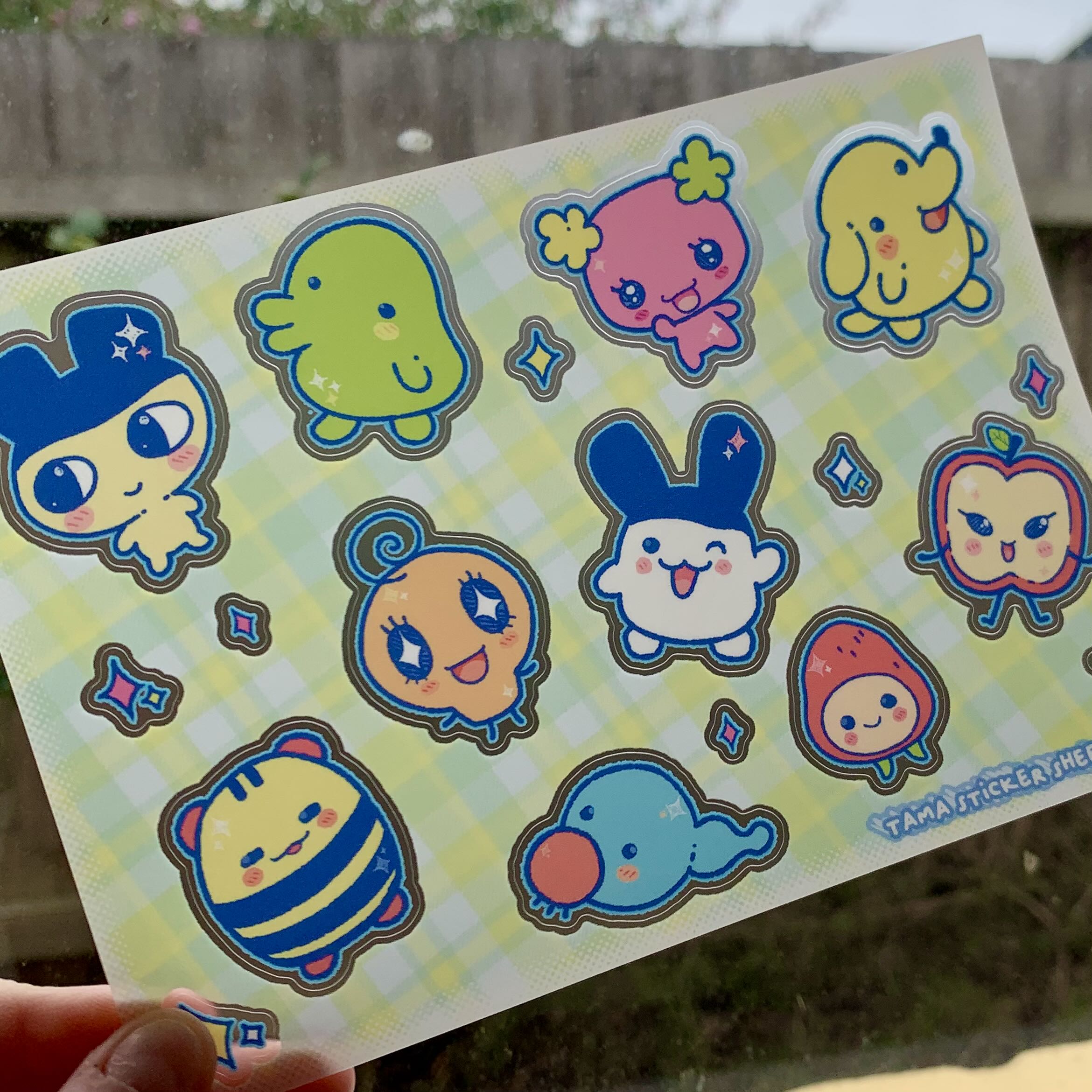 Fan-made A6 vinyl sticker sheet featuring characters from Tamagotchi.