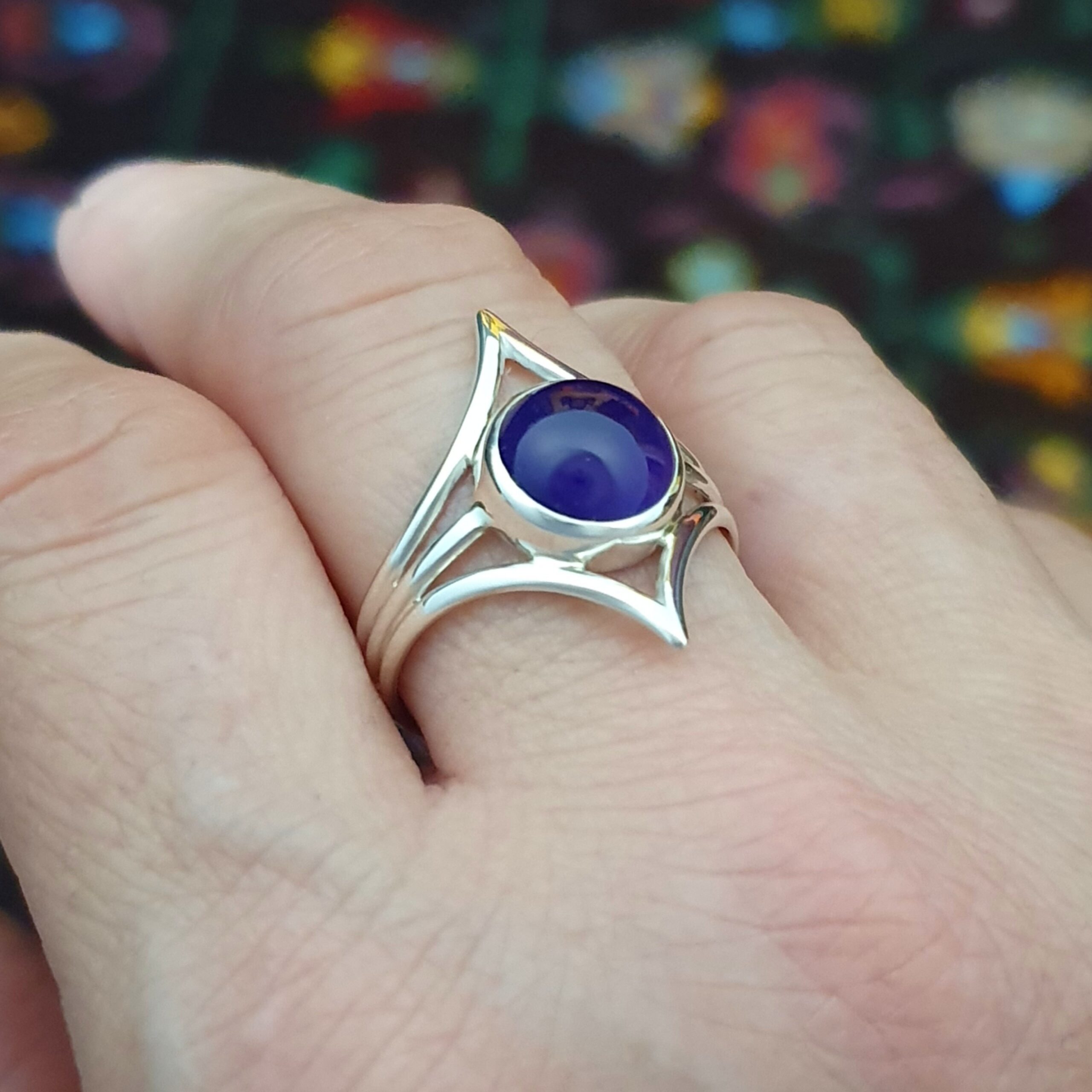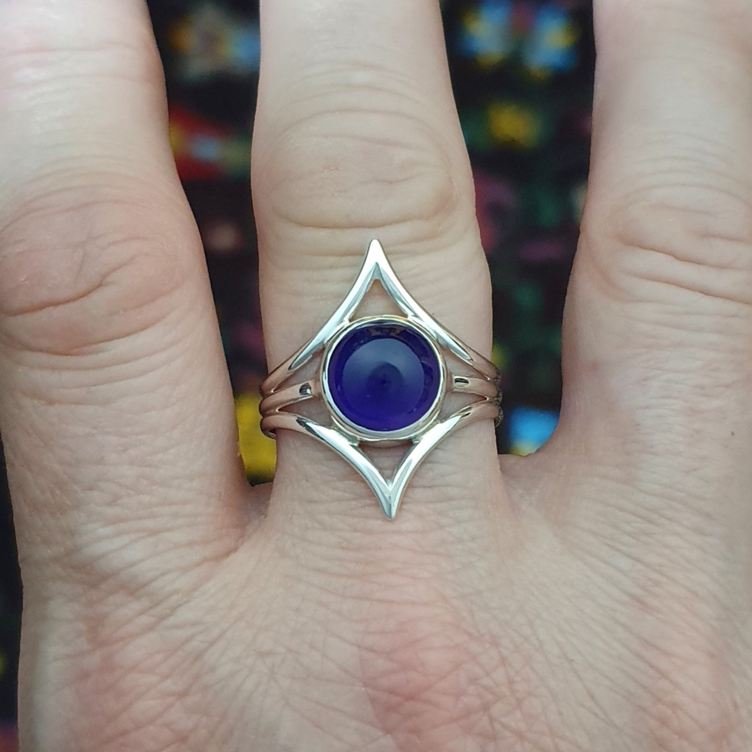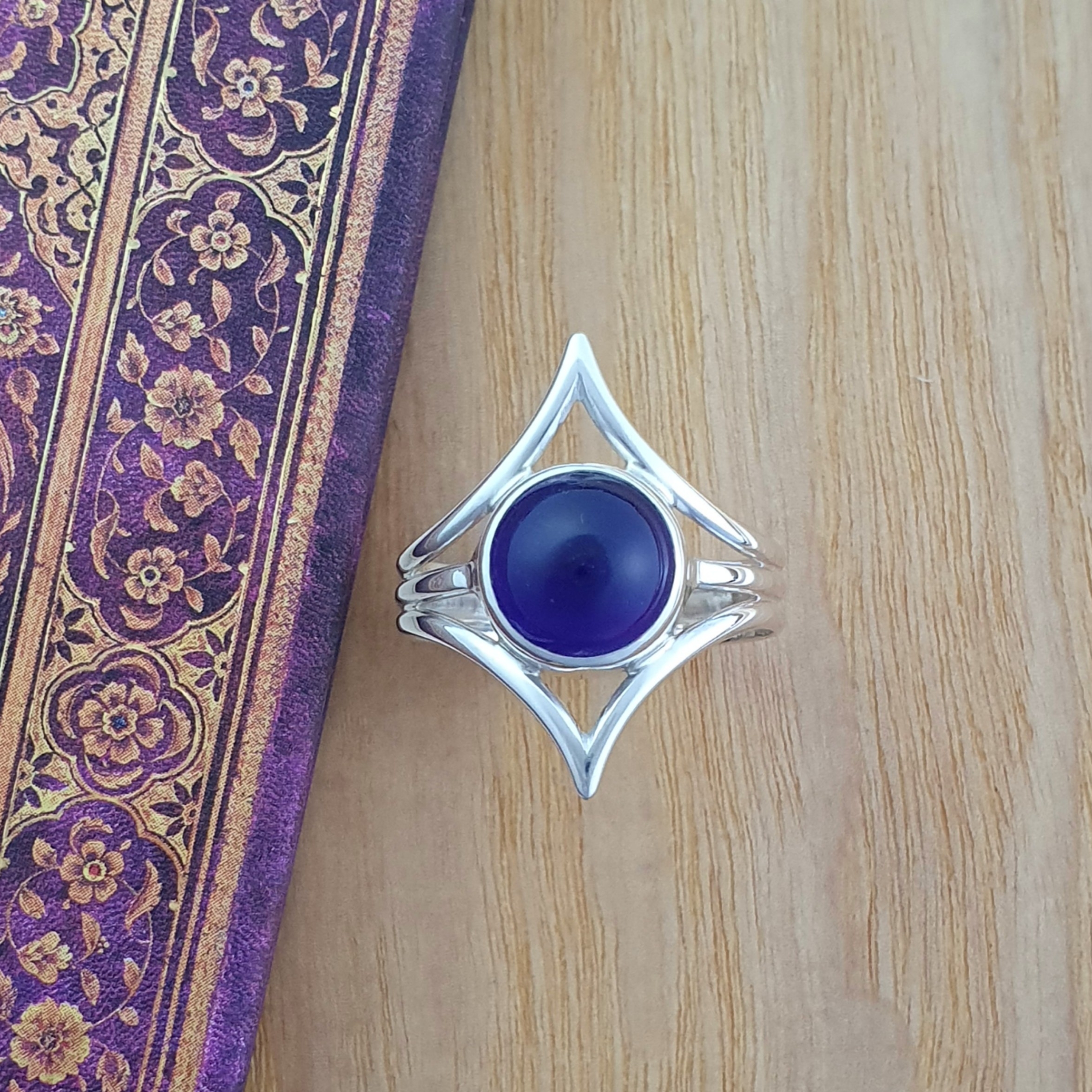 Sterling silver split band ring with points set with deep purple Amethyst cabochon, handmade by Flying Lobster Jewellery. Amethyst 10mm. Front width 24mm. Width at the back 5mm. Size U. SW1470