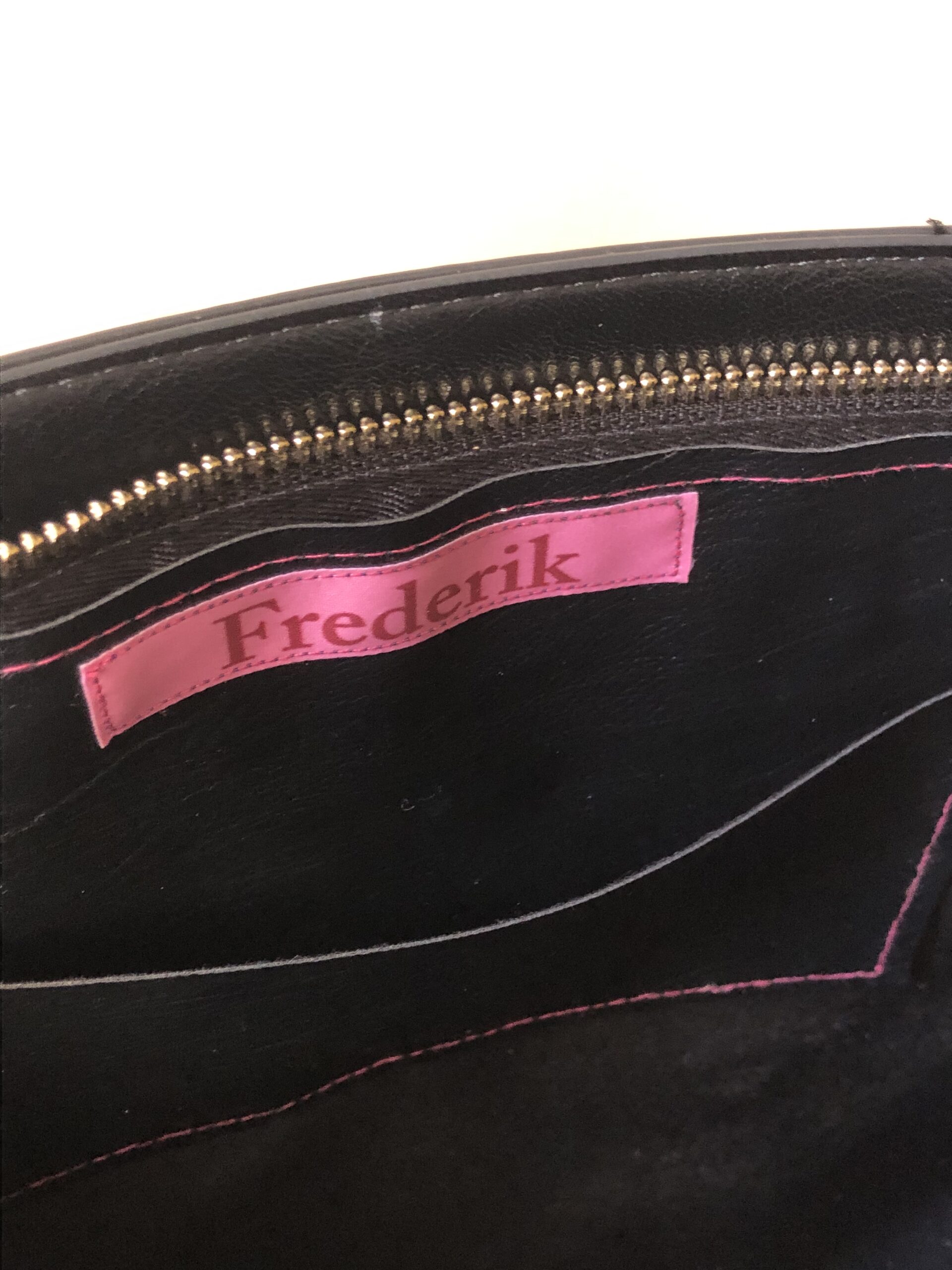 Gold stud feet and internal zip pocket and a second open pocket.