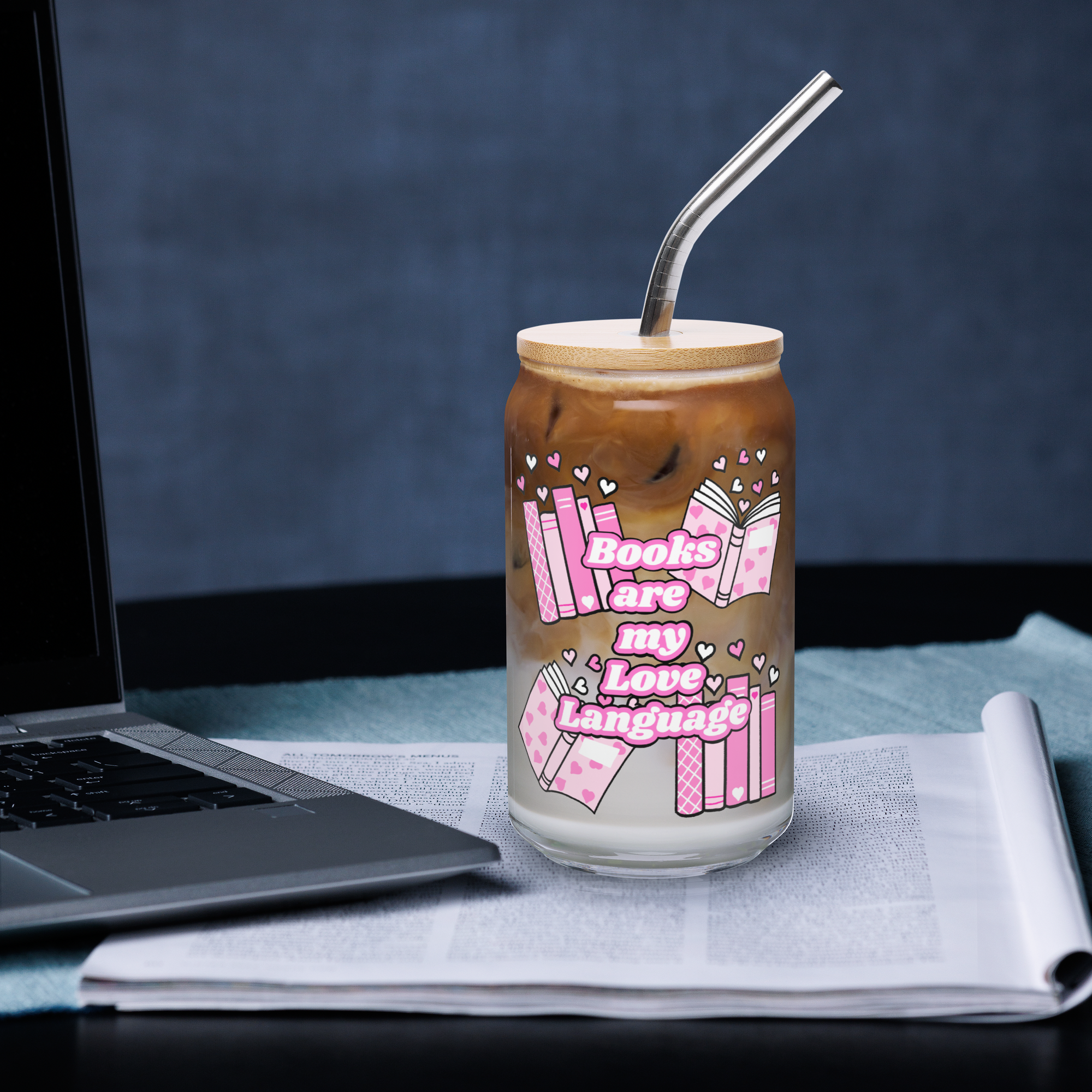-Glass can, metal straw and bamboo lid.
