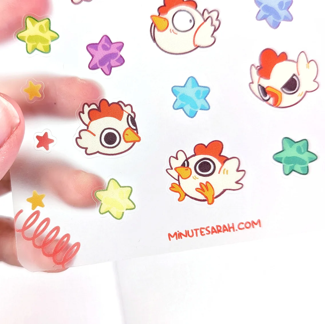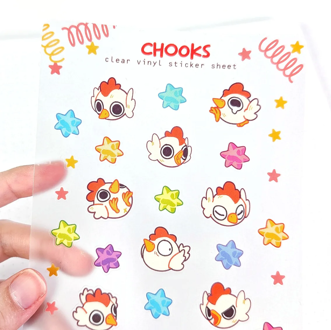‘Chooks’ Clear Matte Vinyl Chicken Sticker Sheet. Approximately A6 size. Made of waterproof and UV durable vinyl with a matte finish. Stickers are opaque clear with a frosted clear backing,