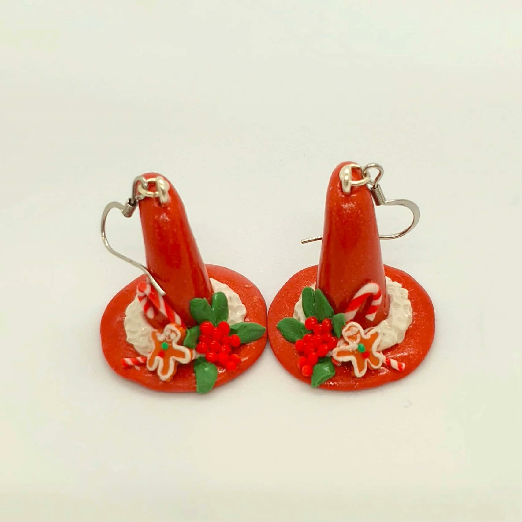 Get into the festive spirit with these festive earrings! These Christmas themed witches hats are adorned with holiday decorations lovingly handcrafted with polymer clay.