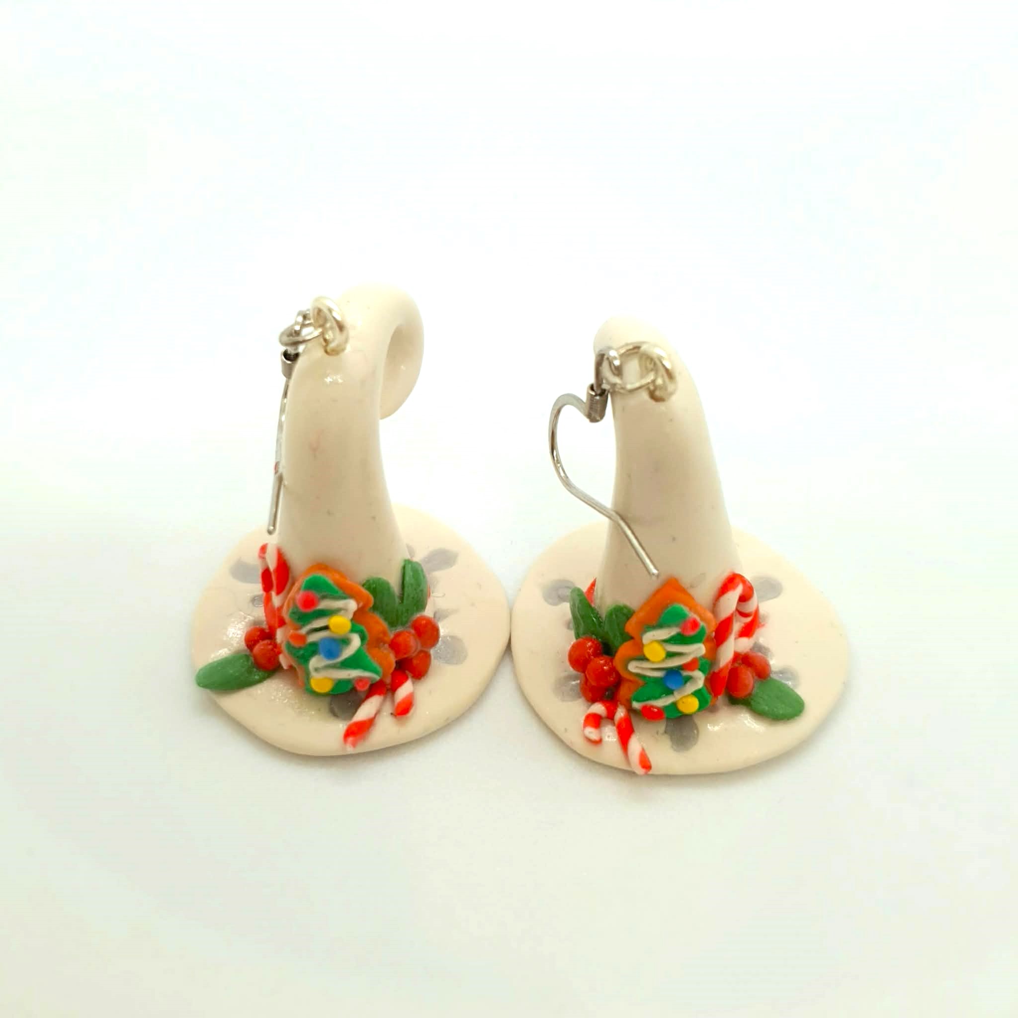 Get into the festive spirit with these festive earrings! These Christmas themed witches hats are adorned with holiday decorations lovingly handcrafted with polymer clay.