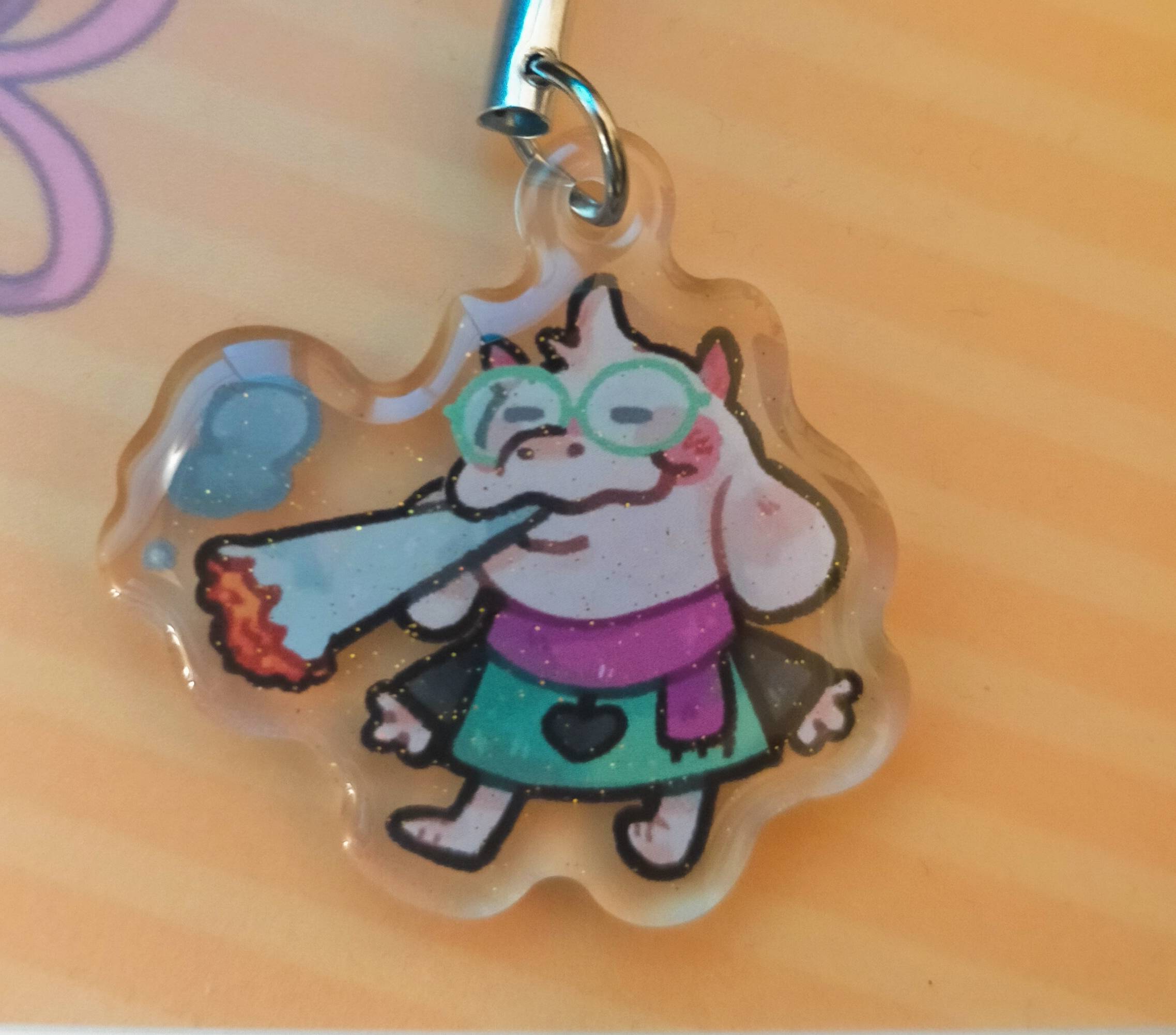 1.5 inch glitter epoxy phone charm of a memed image of Ralsei from Deltarune.