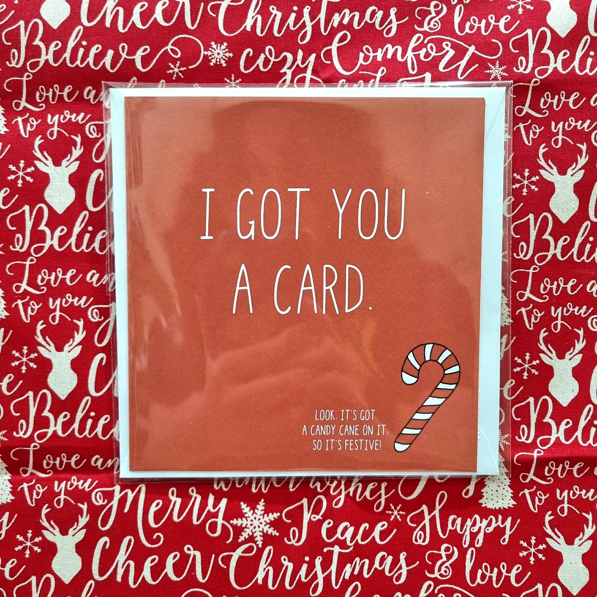A funny Christmas card featuring a candy cane and the phrase ‘I got you a card. Look, it’s got a candy cane on it, so it’s festive!’. Card comes blank and with an envelope.
