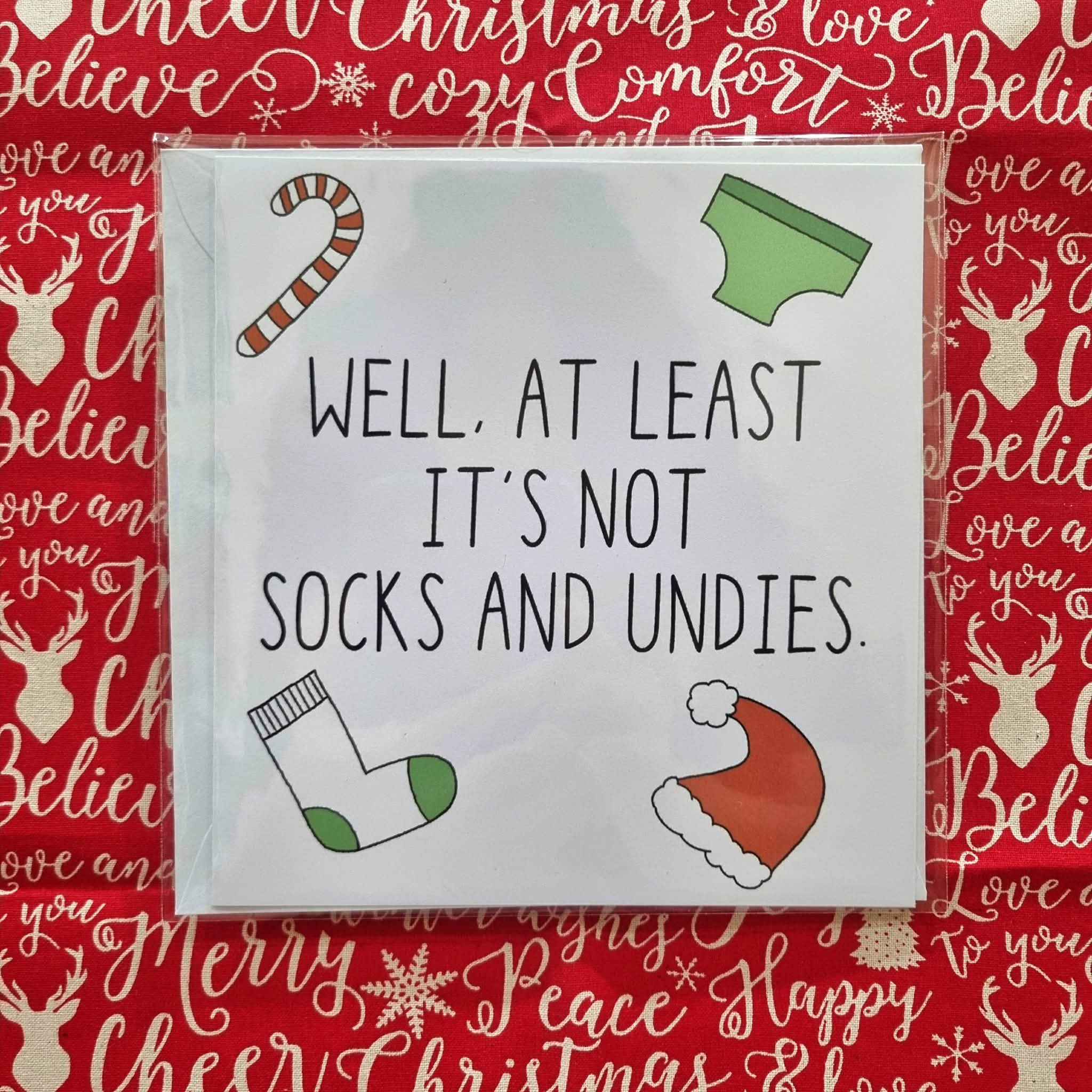 A funny Christmas card featuring the phrase ‘well, at least it’s not socks and undies. Card comes blank and with an envelope.