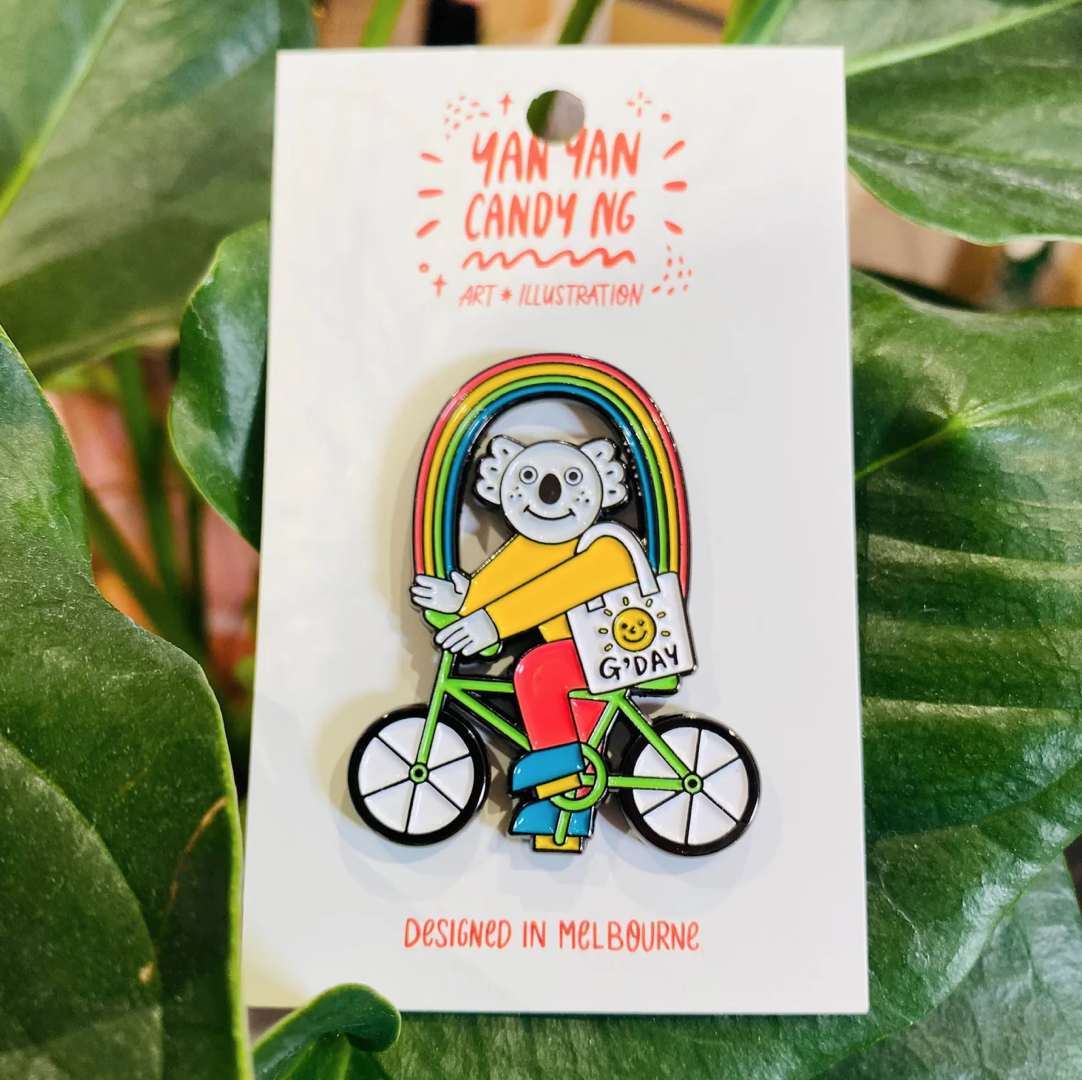A koala on a bike, cycling through the city and feeling like a rainbow – full of colour, joy, and good vibes all around!