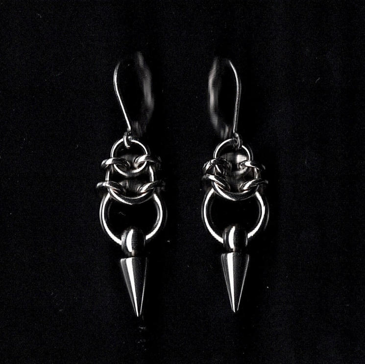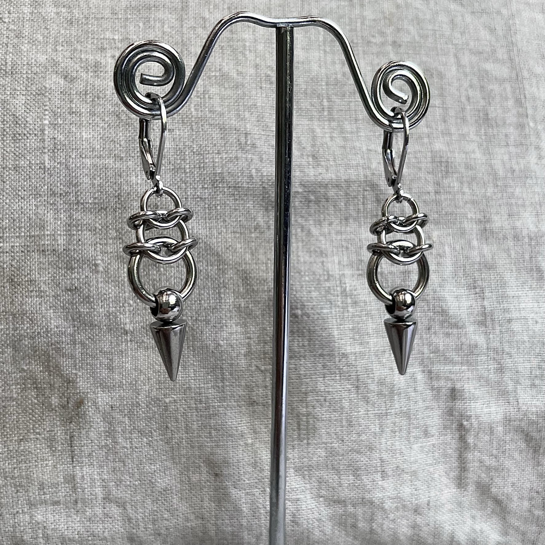Handwoven stainless steel dainty chainmail earrings with spike detailing.