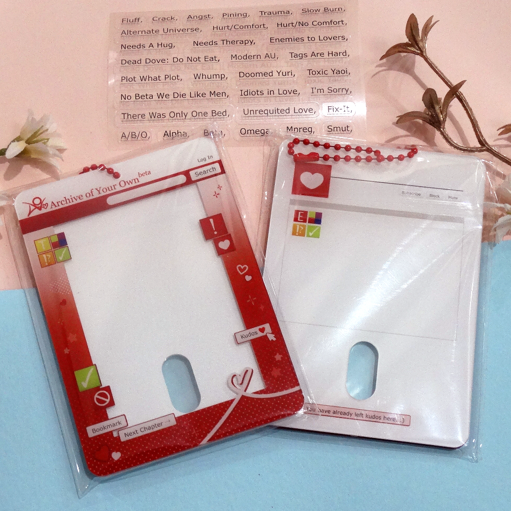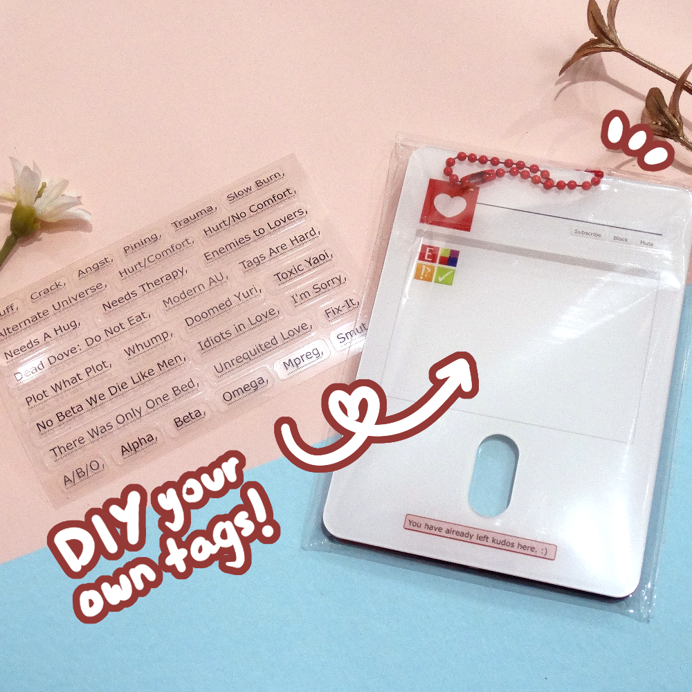 comes with one acrylic photocard holder and a transparent tag sticker sheet to customise a fic for your blorbo to your hearts content ❤️