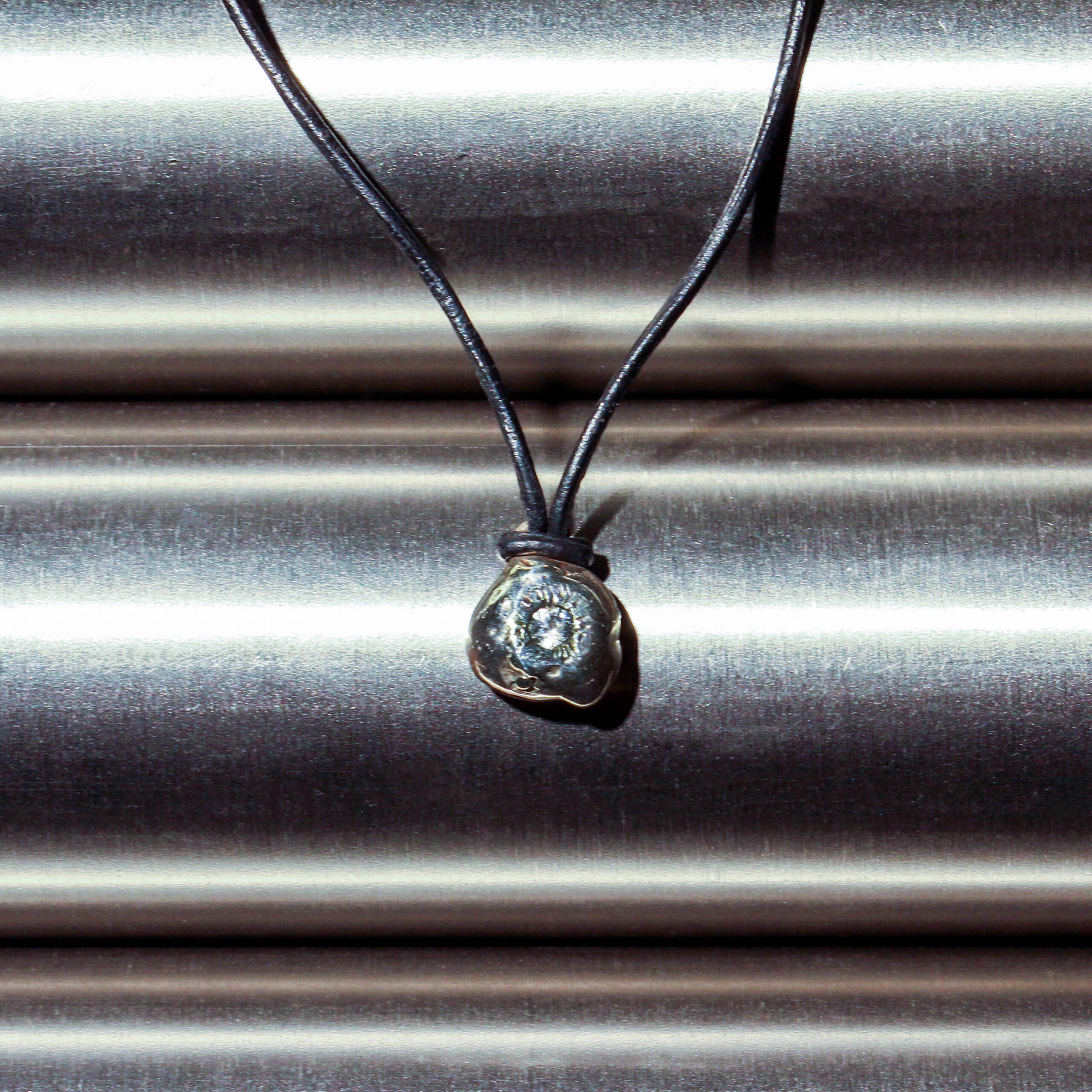 Drop cast silver charm with starburst set white sapphire on a leather cord.