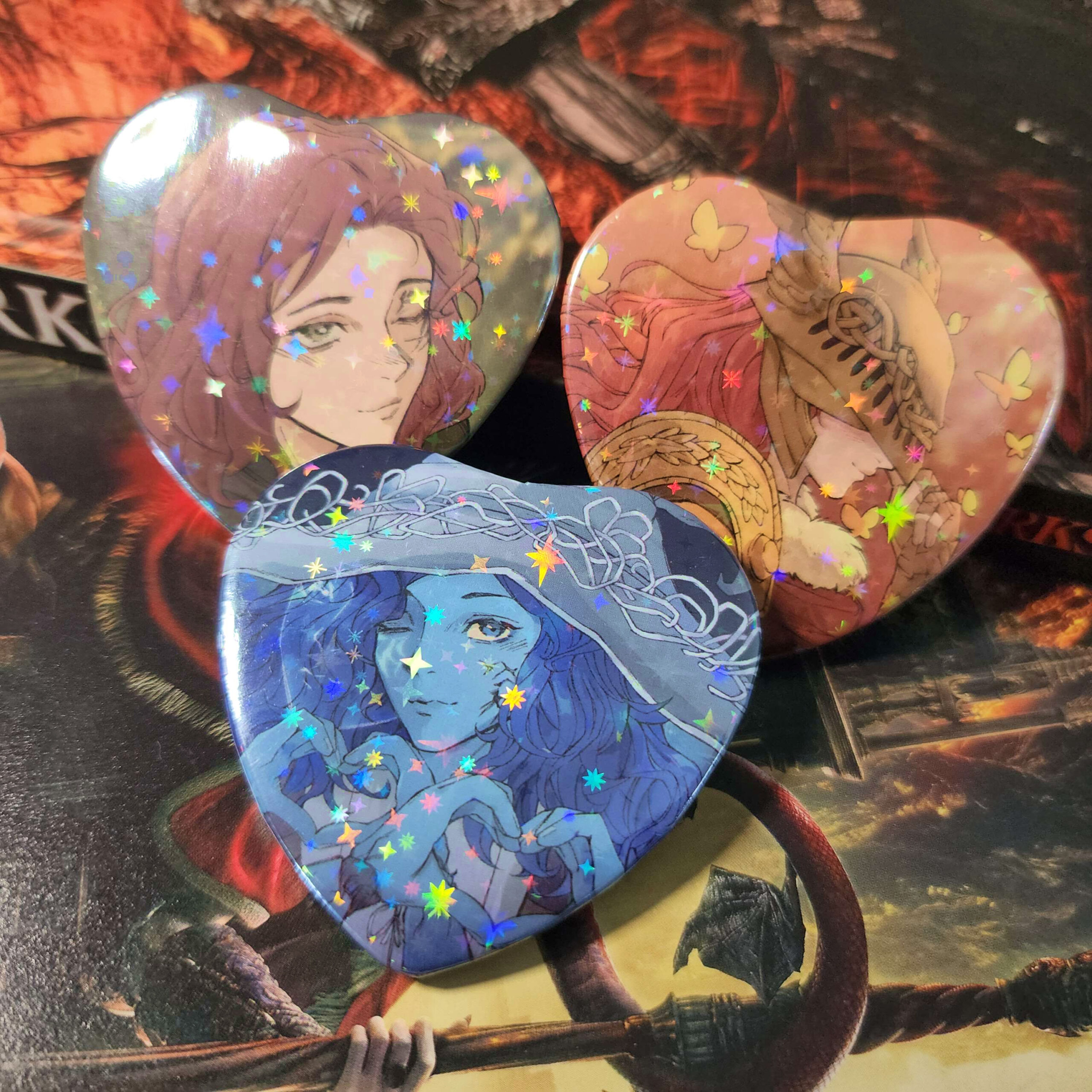 The Elden Ring girlies as holo heart-shaped badges!
