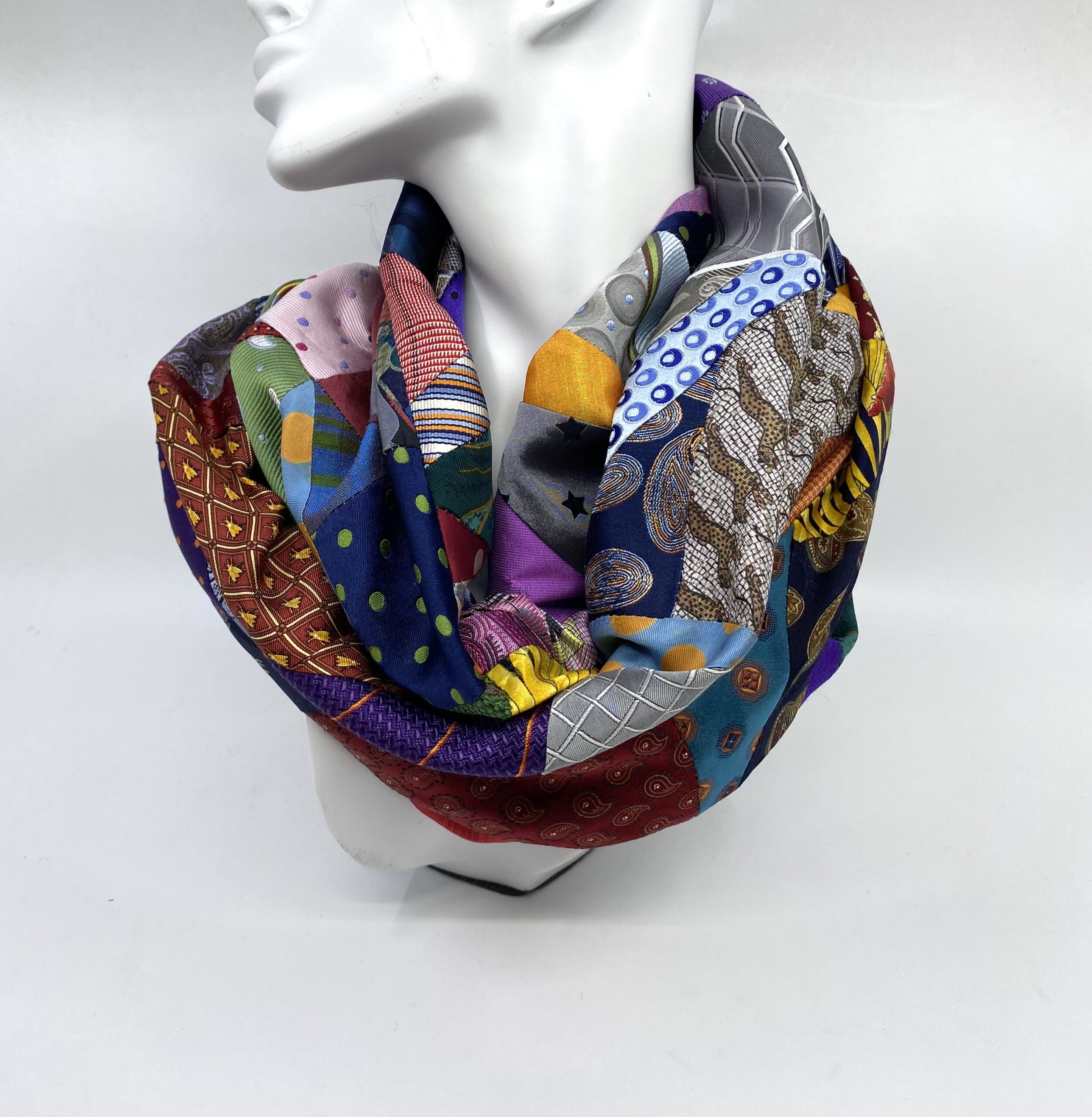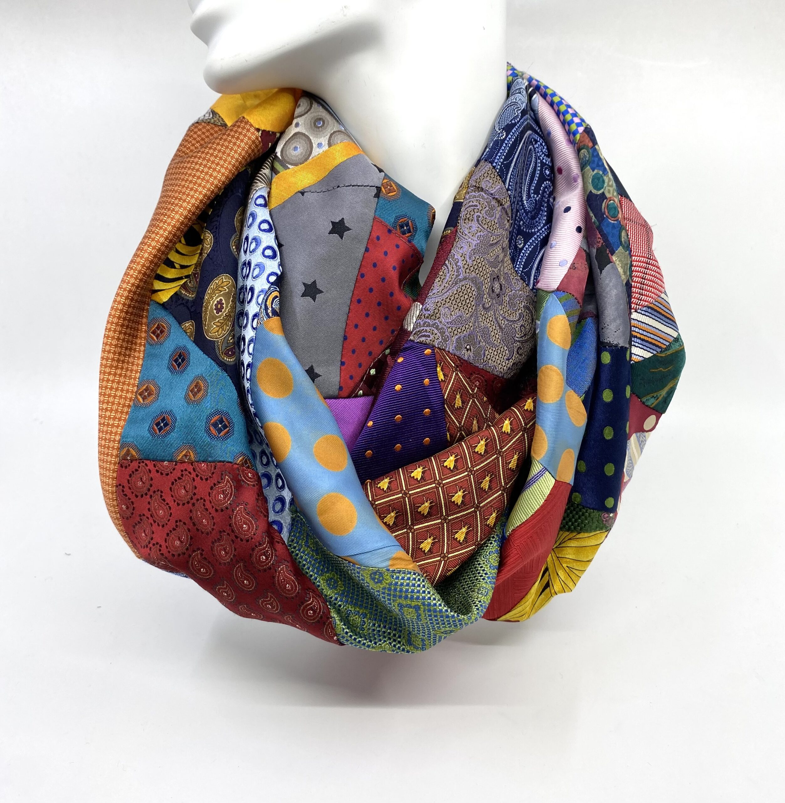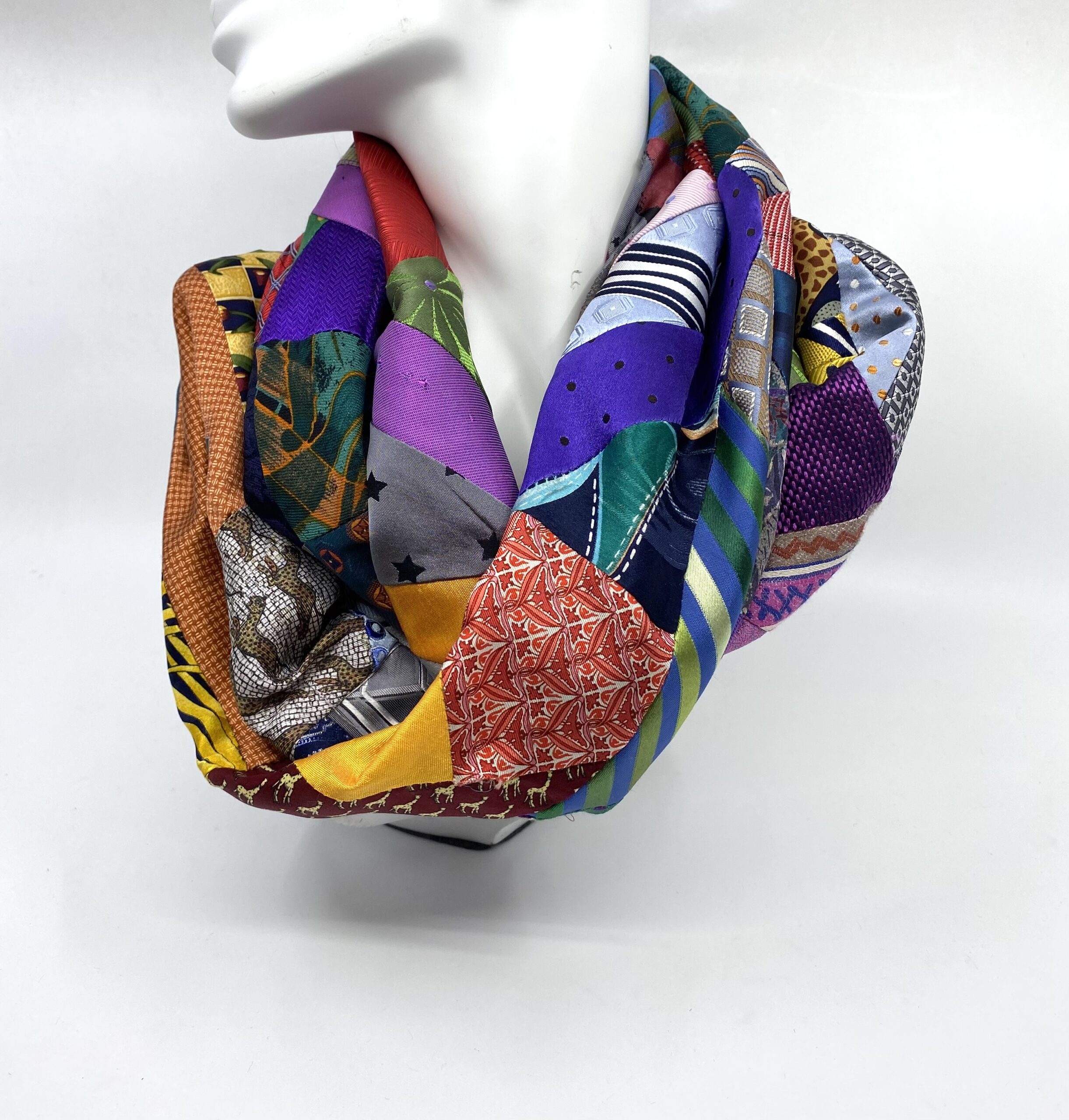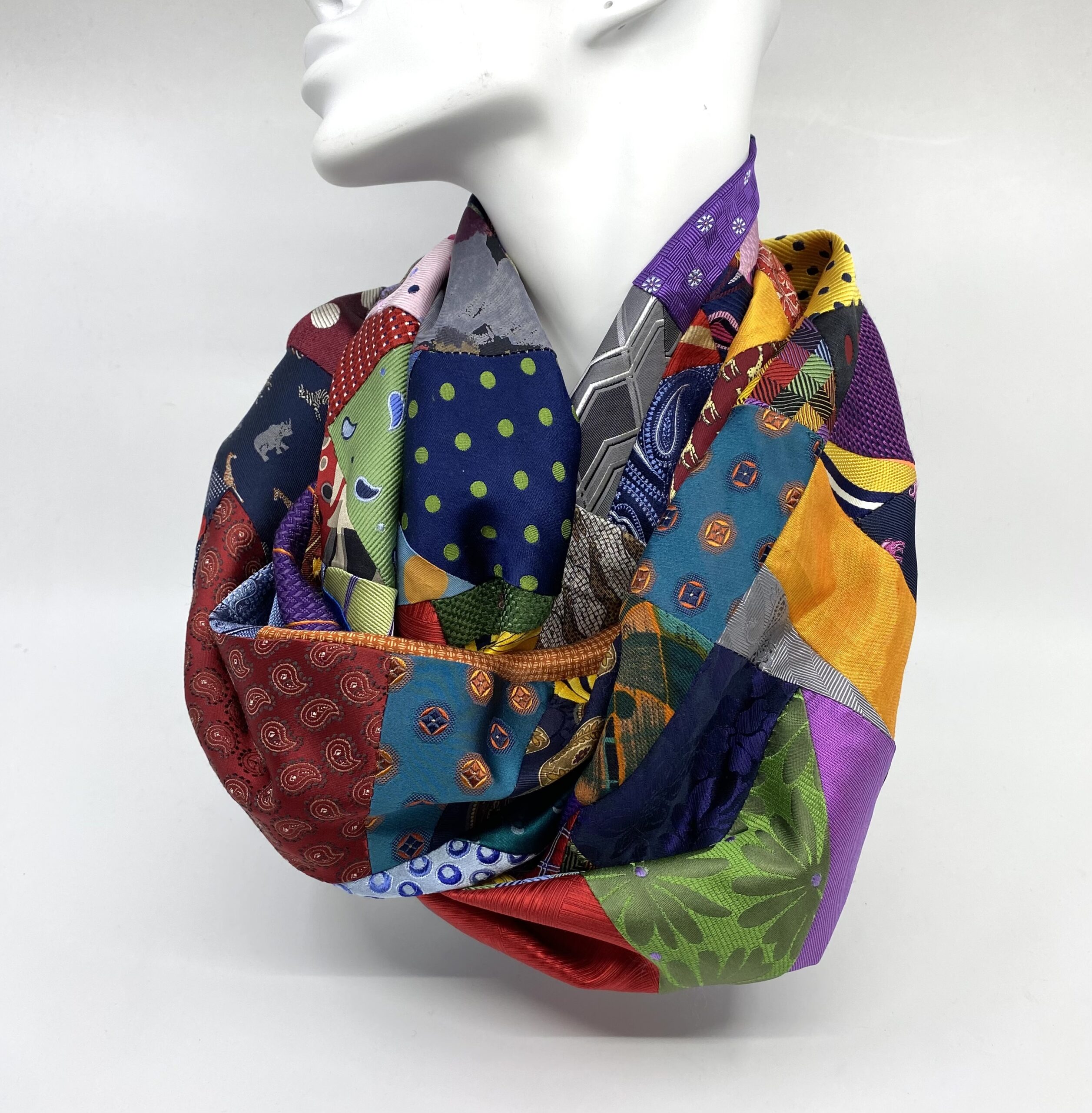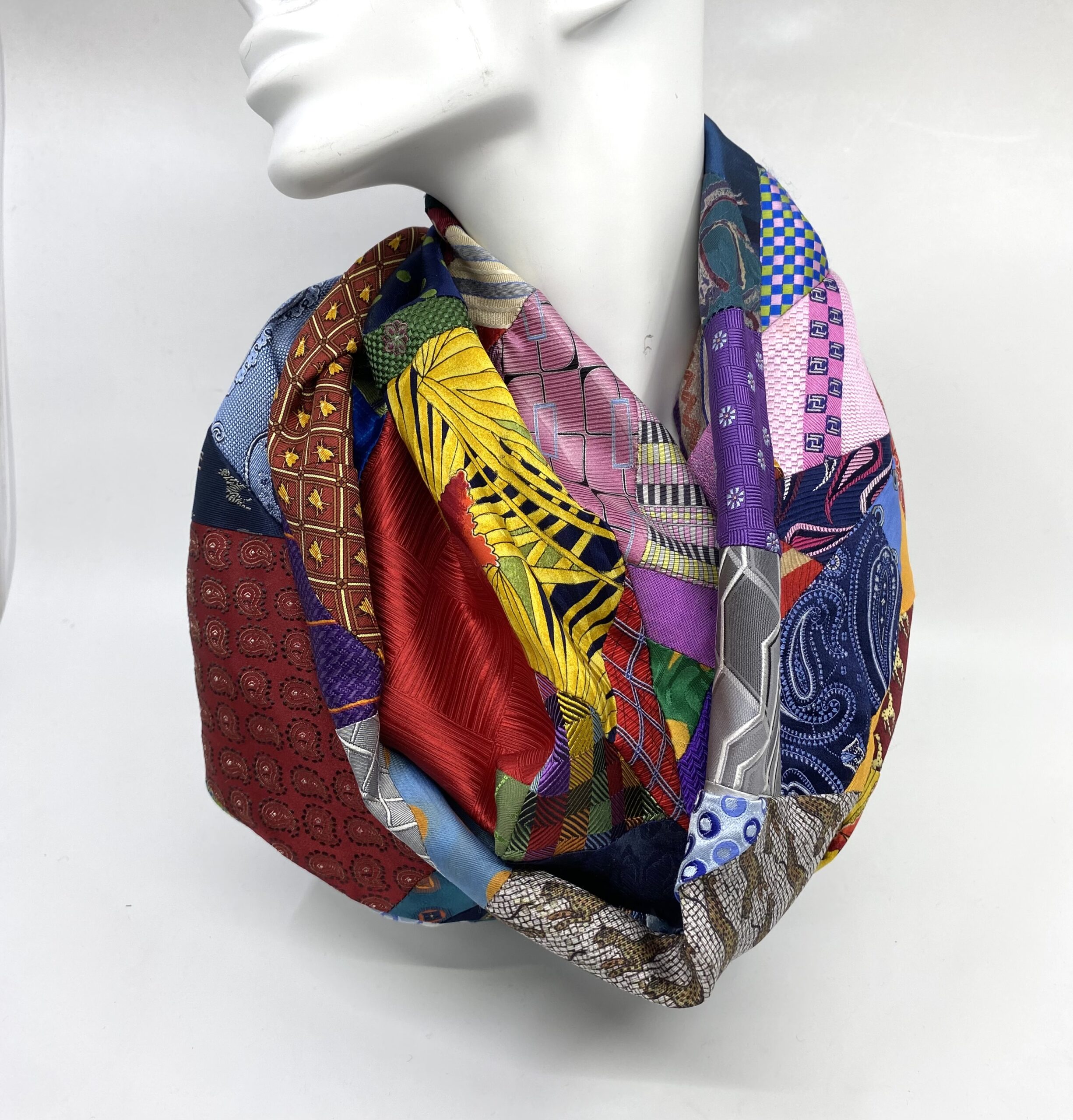 This silk infinity scarf is handcrafted from offcuts of preloved silk ties in every colour imaginable! These offcuts represent but a few of the silk ties that have been upcycled as scarves, headbands and scrunchies this year. Every offcut is gorgeous and together these offcuts make a beautiful infinity scarf to be treasured.
