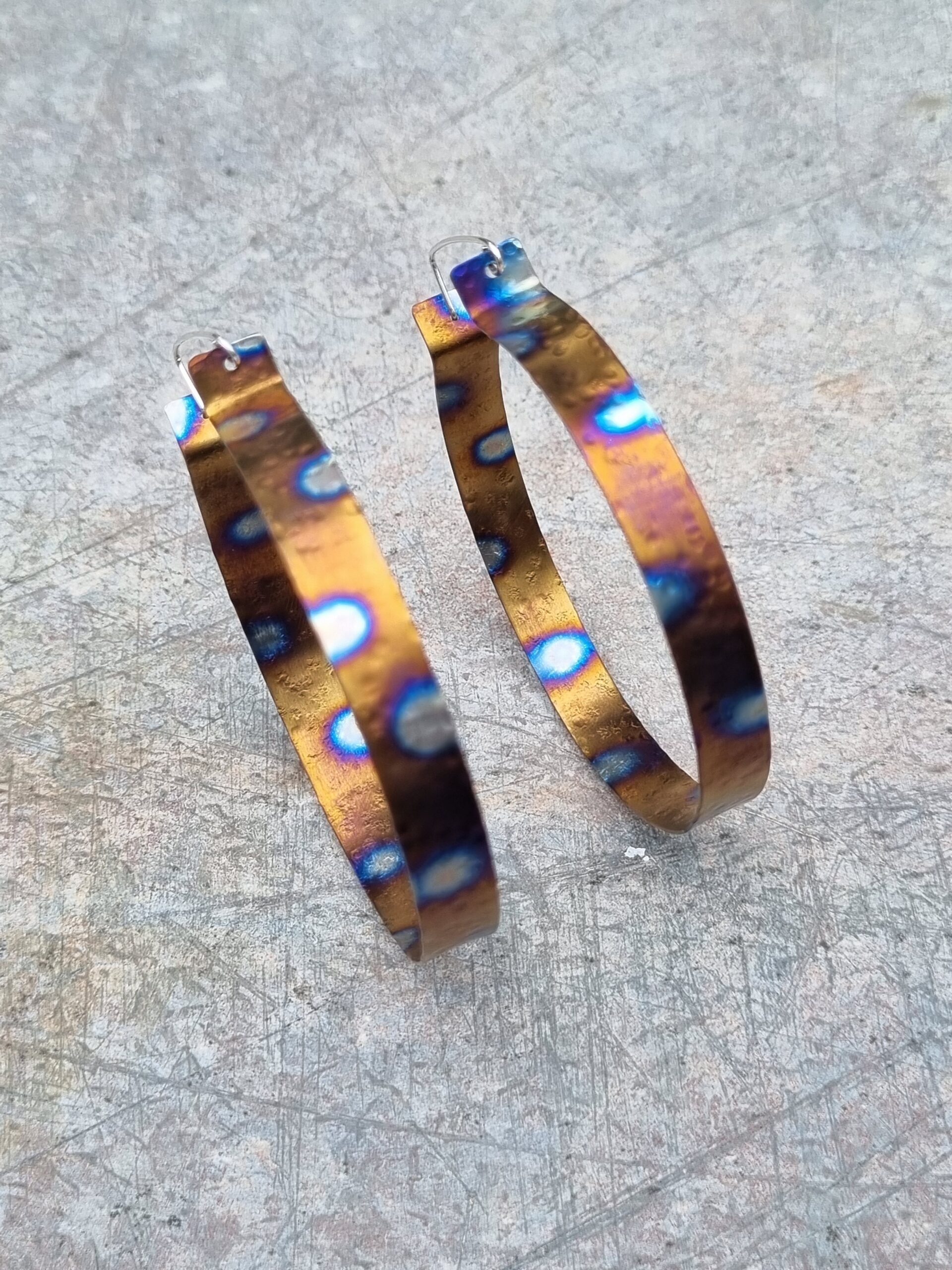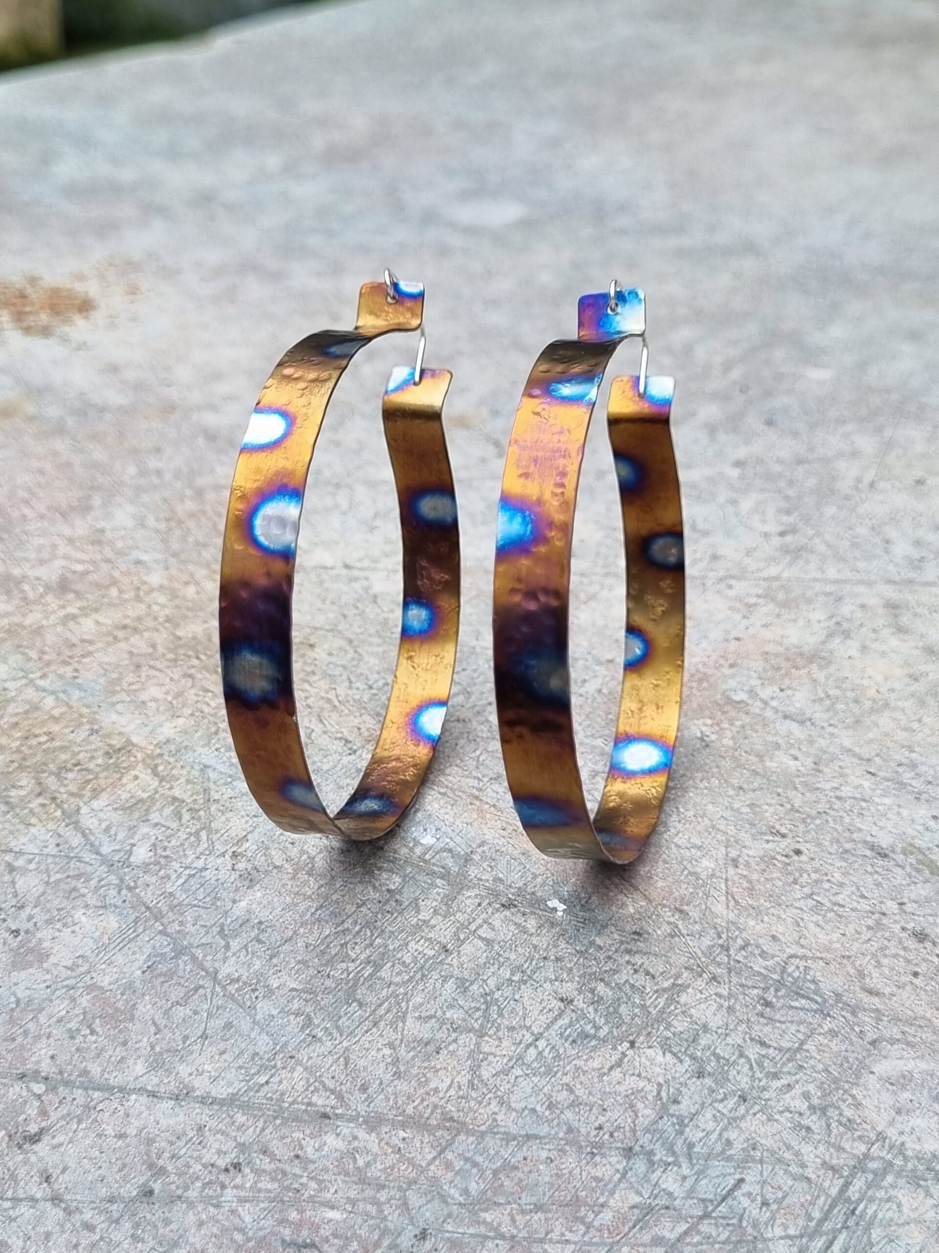Each piece is one of a kind individually made with hammered and coloured ultra light titanium, (textures and colours may vary slightly).