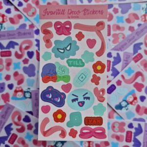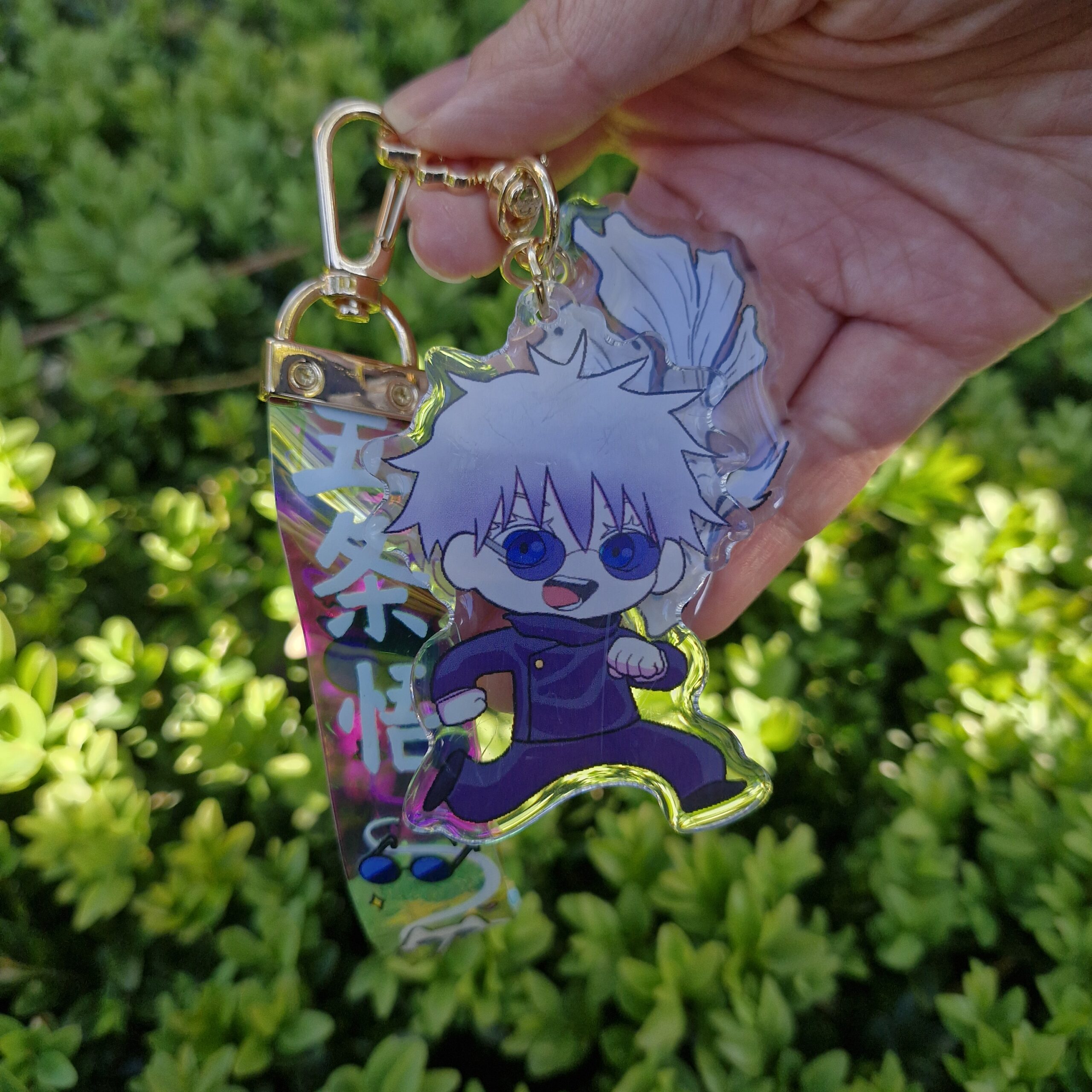 A cute keychain set of Gojo, a white beta fish, and some of the sorcerer’s favourite items on the lanyard strap!!