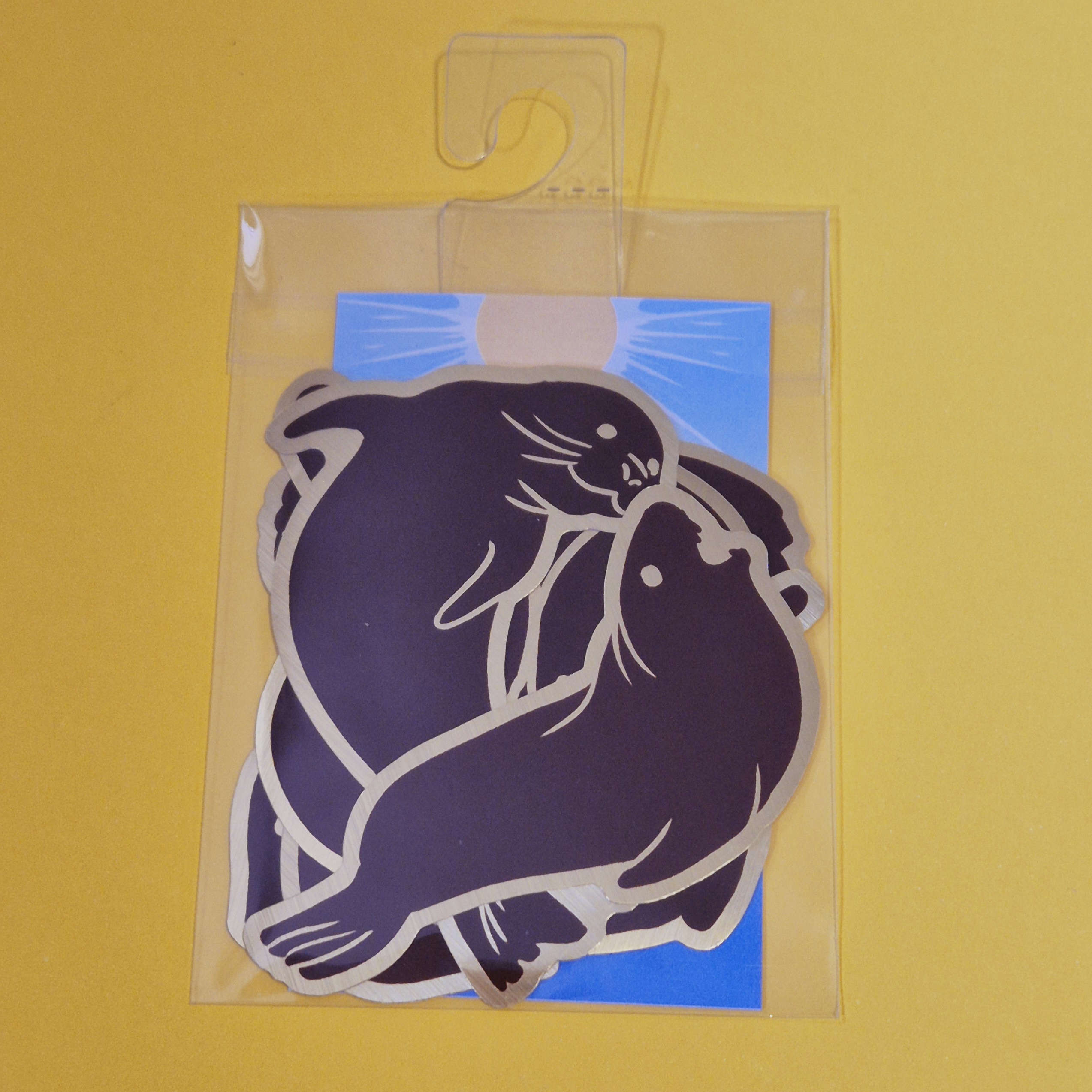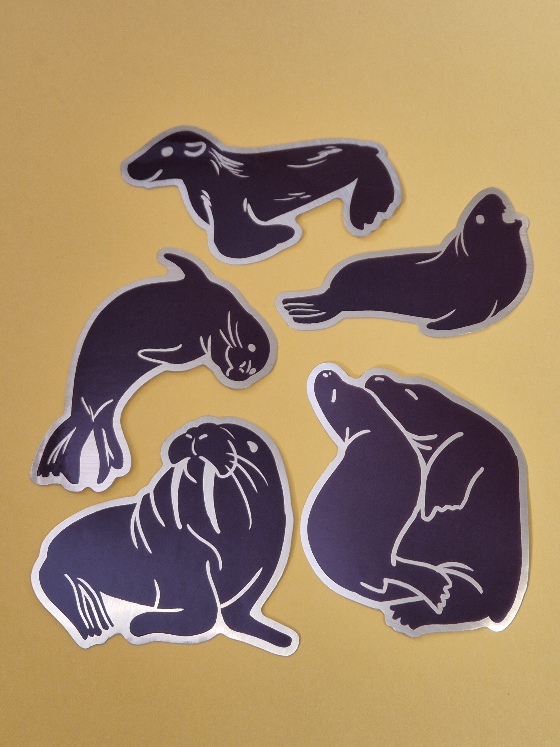 5 brushed gold stickers featuring different kinds of seal (and a walrus). Very shiny!