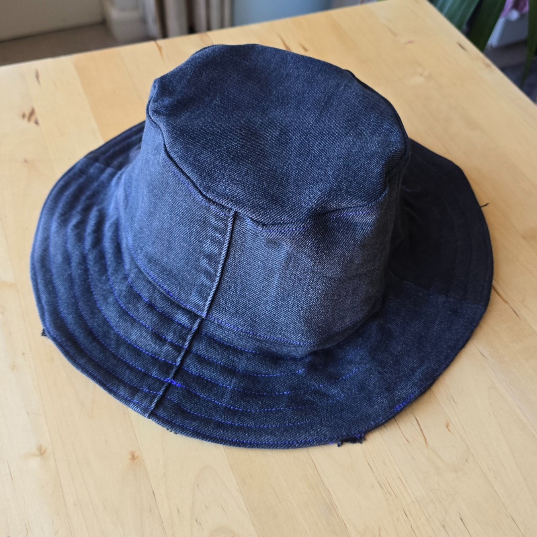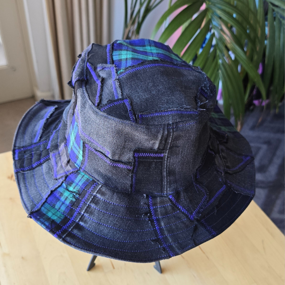 Zero waste reversible Bucket hat made from denim scraps and thrifted tartan.