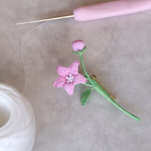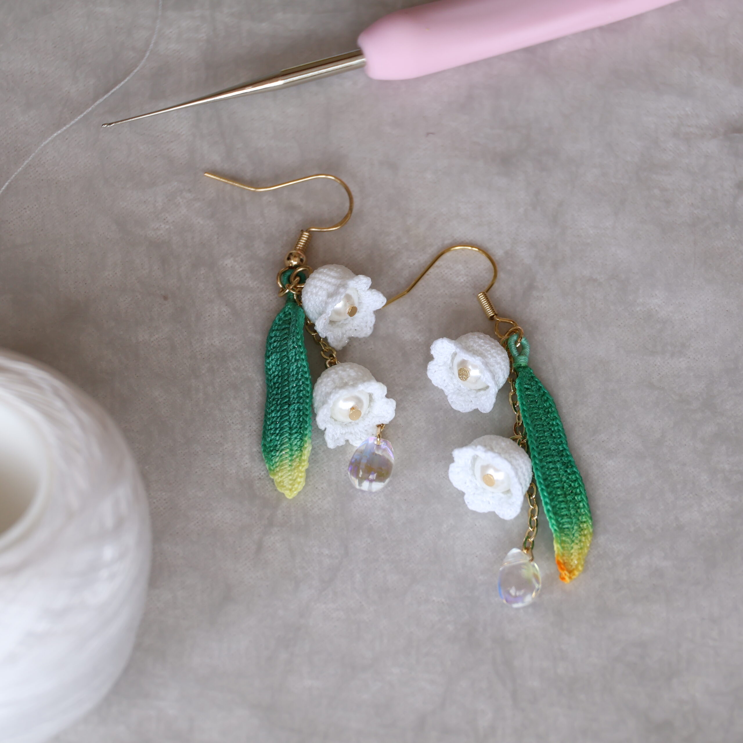 Flower language: return of happiness — Dangling bells crocheted in No. 80 cotton yarn, tinted with premium fabric dye, and shaped with a 0.4 mm hook ring in gentle joy.