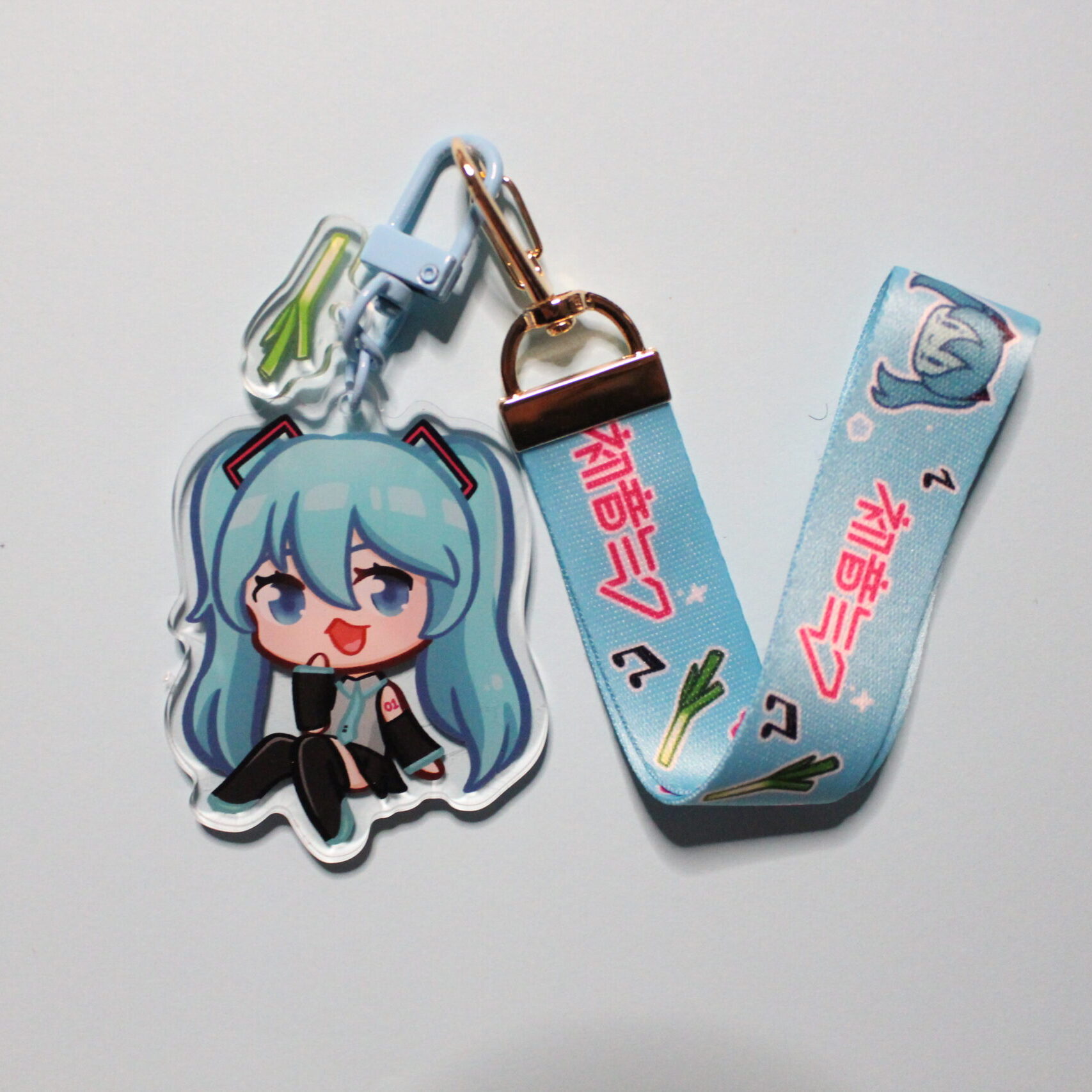 This is an acrylic keychain of Hatsune Miku coming at 5.5CM X 5.5CM with a matching blue keyring, a small leek, and a matching blue landyard.