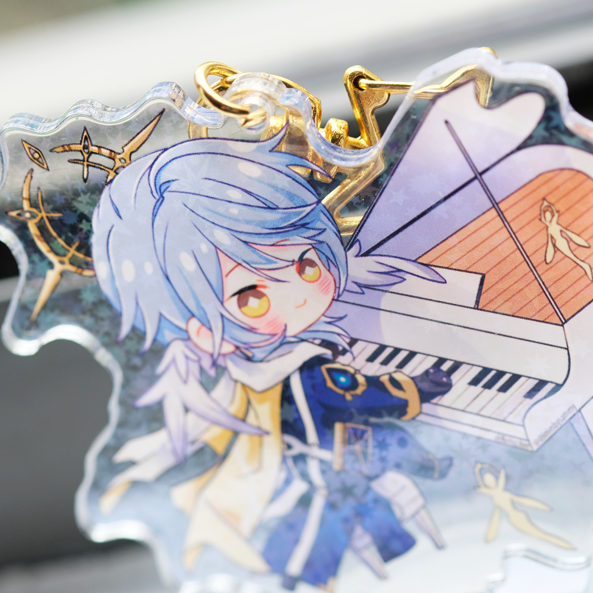 Holographic acrylic charm/standee combo of Sunday playing the piano from Honkai: Star Rail!