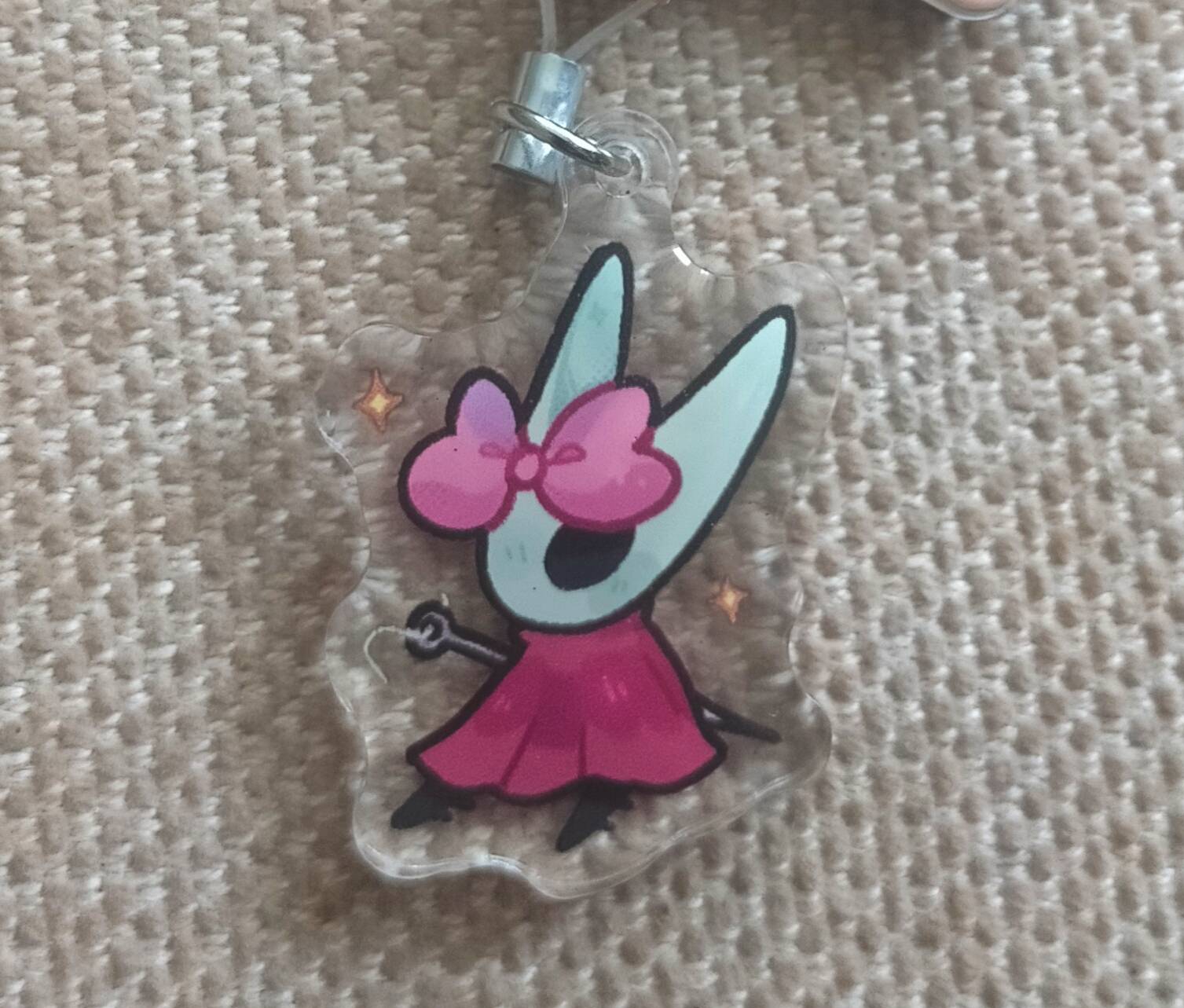 1.5 inch front side glitter epoxy phone charm of Hornet from indie game series hollow knight! Has a white loop attachment.