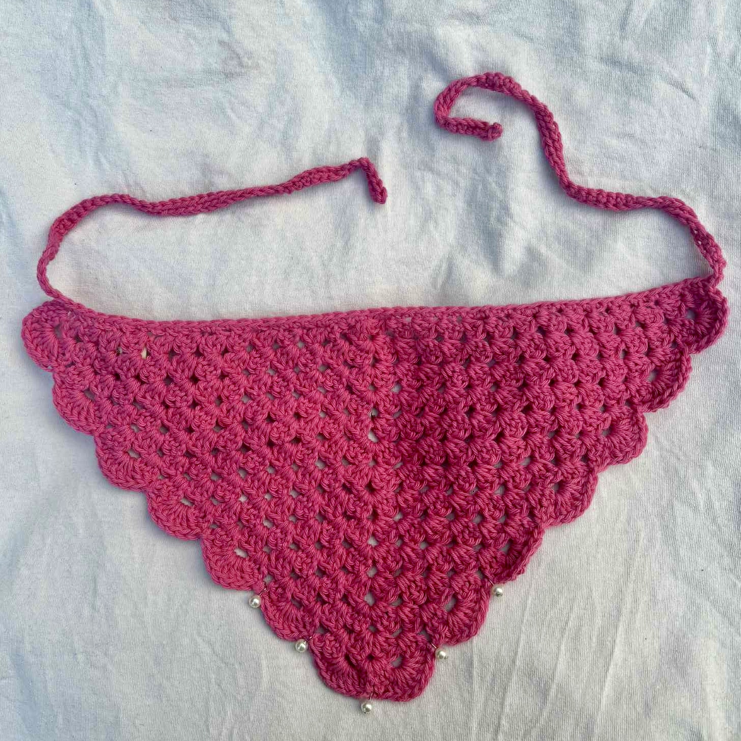 This bandana is made using a hot pink cotton yarn, making it light and floaty – perfect for the summer heat! These pearl details are handmade by me, using a silver attachment. Giving this bandana a fun and unique added quality, and some sparkle✨