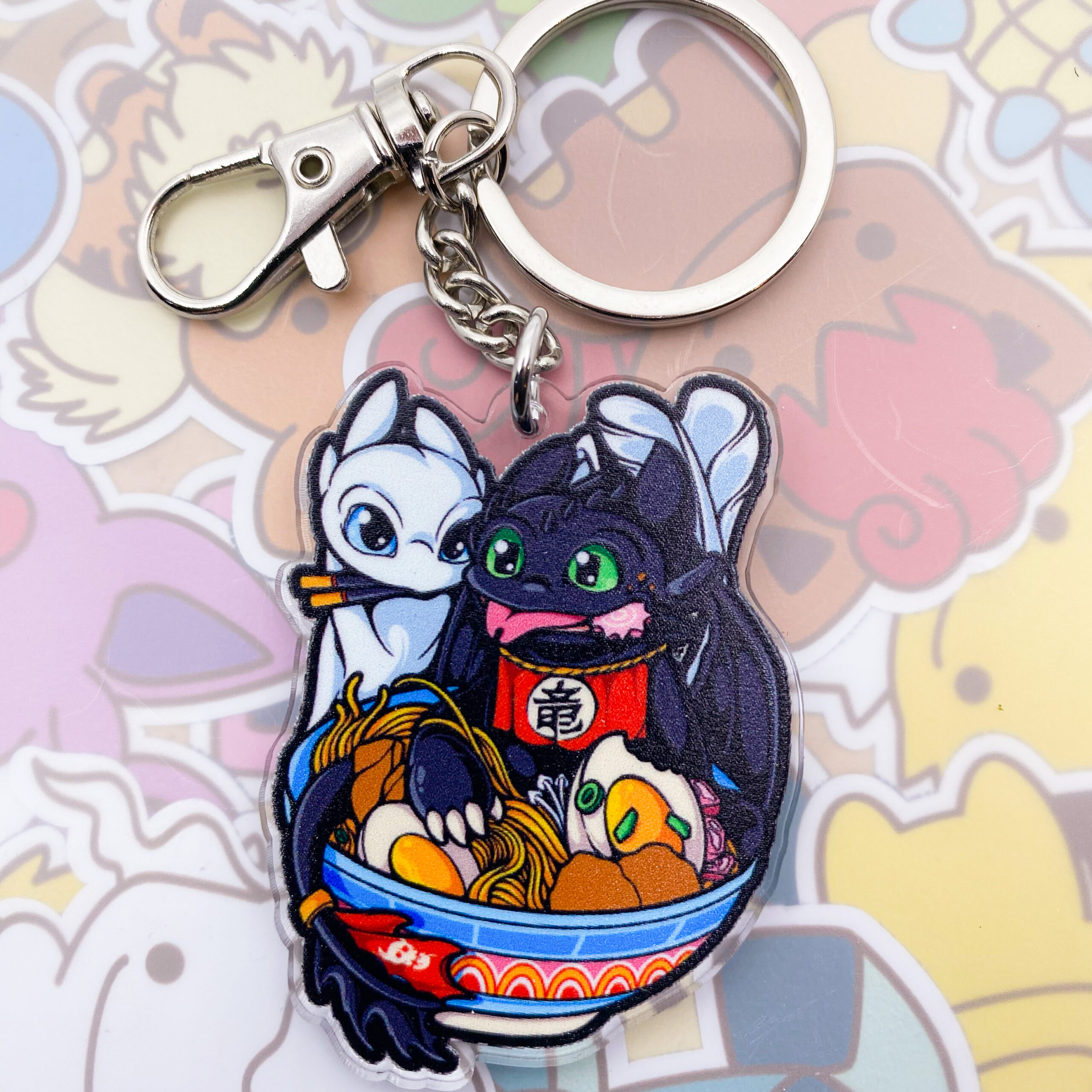 Acrylic Keyring featuring Toothless and Lightfury eating Ramen with metal clasp and ring