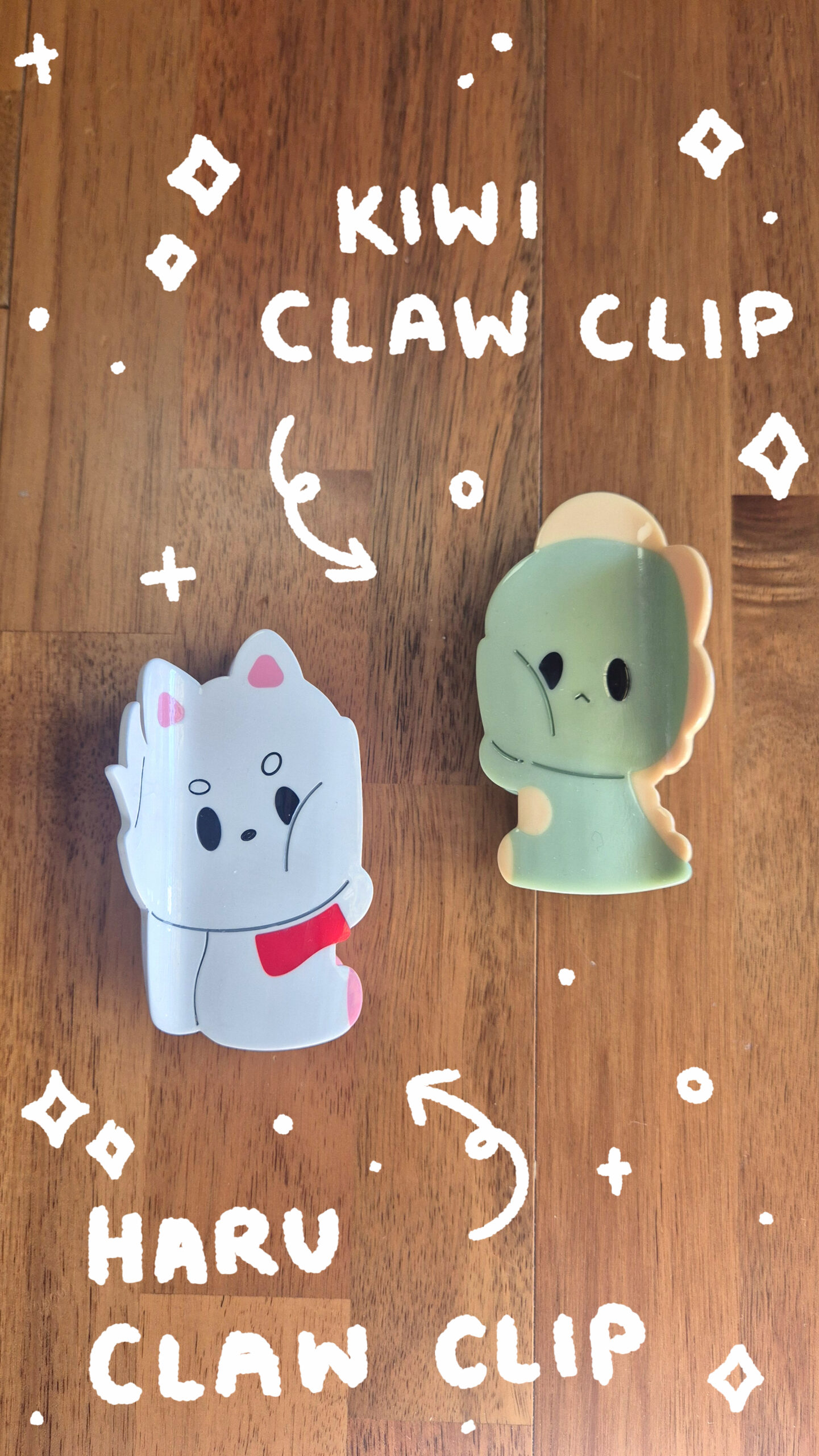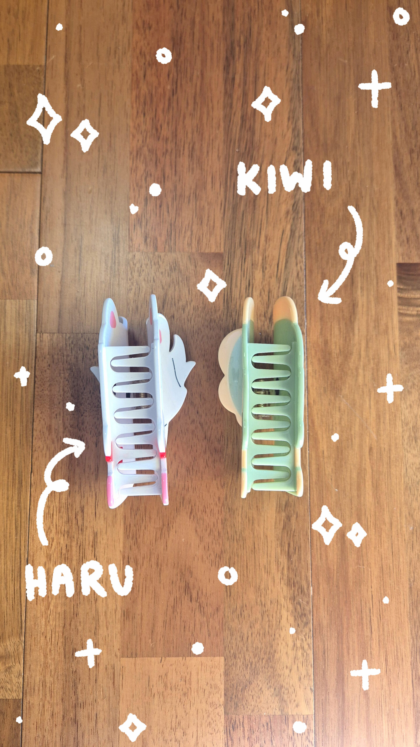 An Acetate Solid Plastic Claw clip based on my two OC ‘Kiwi’ and ‘Haru’.