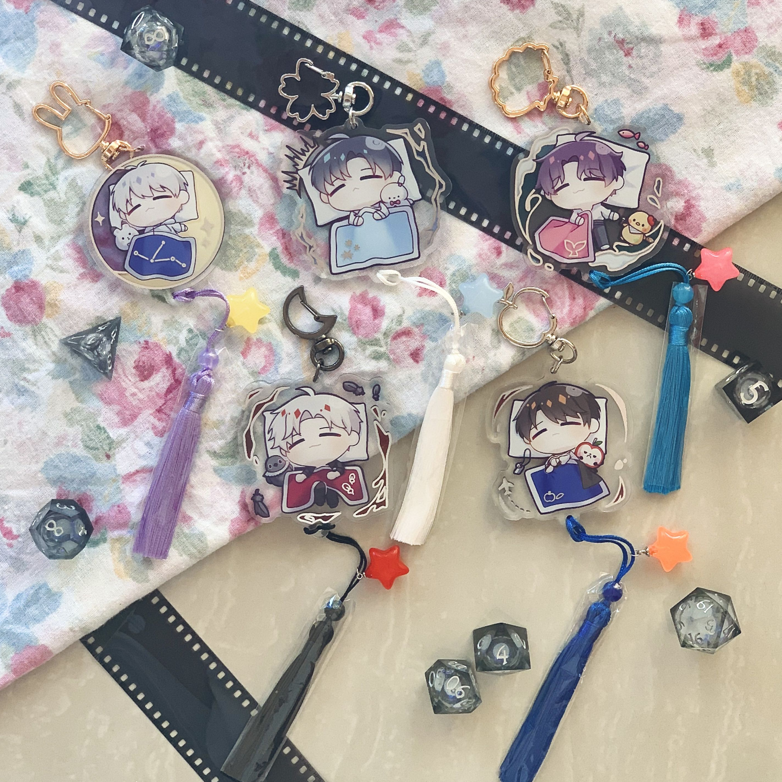 Featuring the love interests from Love and Deepspace all snug and cozy in bed! >< All keychains have silver foil on both sides, as well as come with a tassel and star accessory attached!