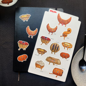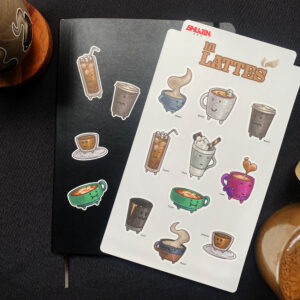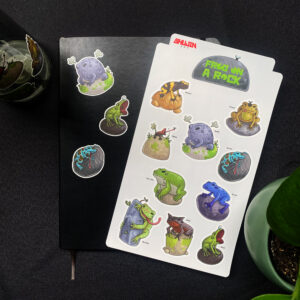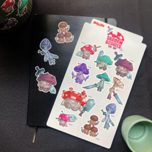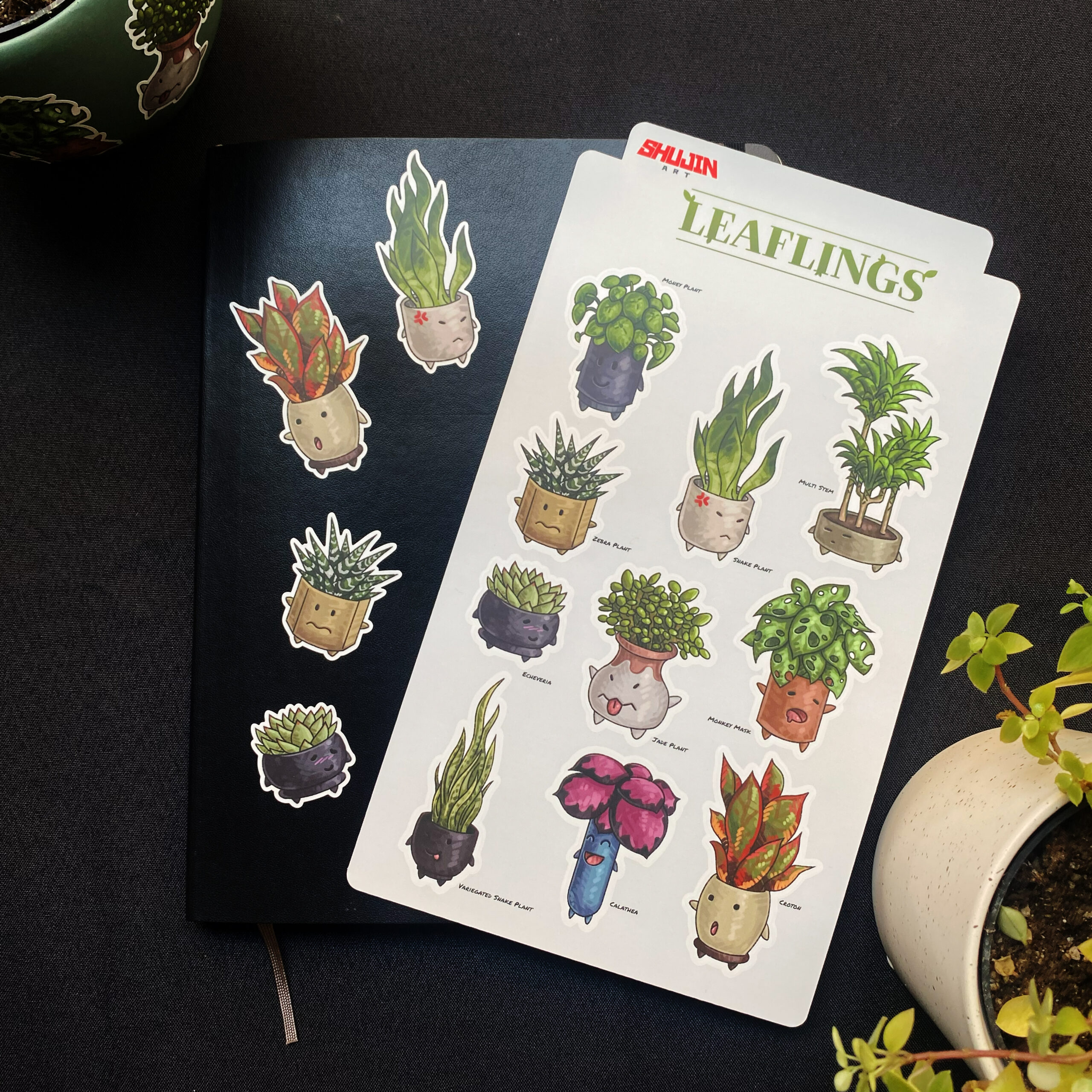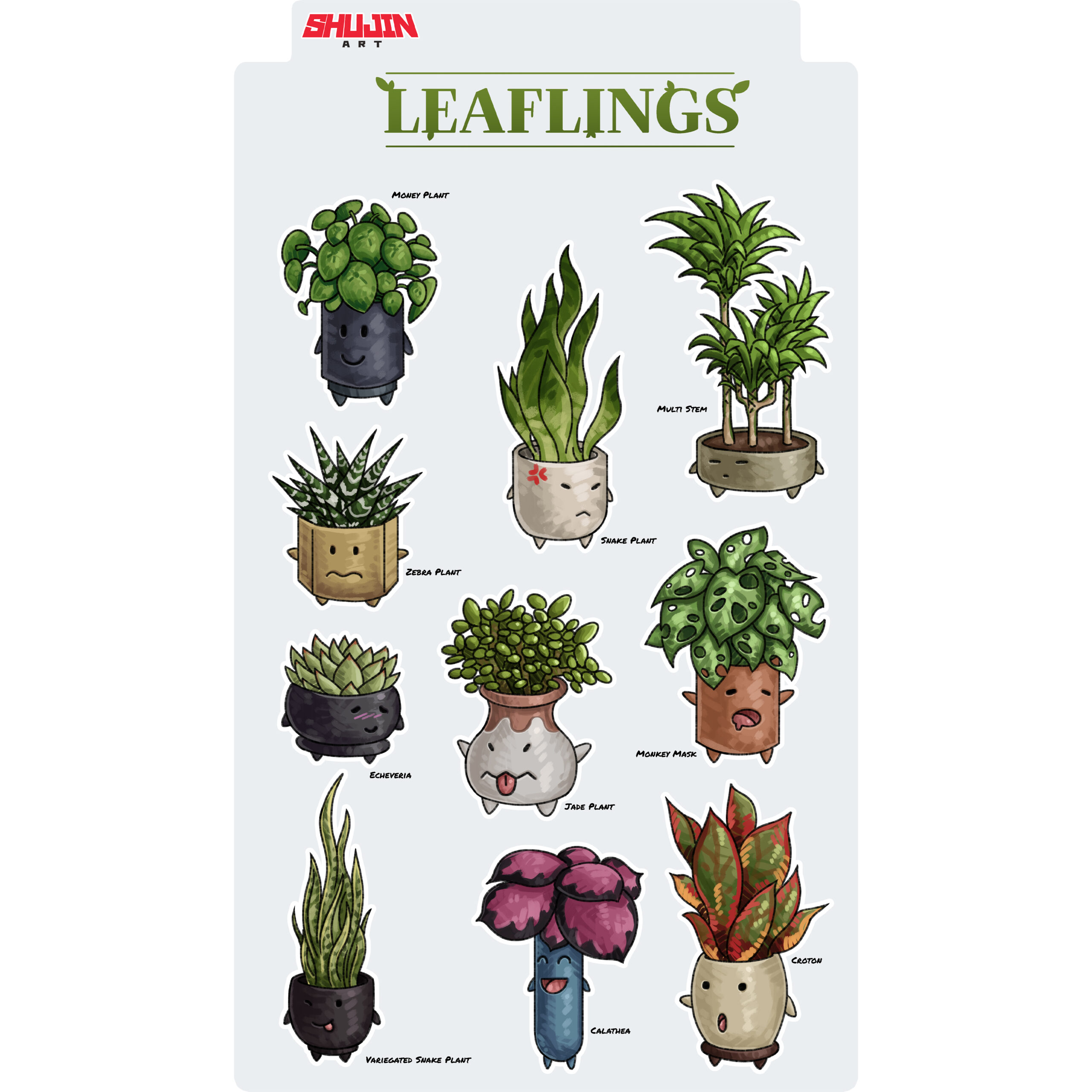A vinyl sticker sheet featuring 10 unique designs from Series 1 of Leaflings, a collection of cute and goofy characters based on different types of plants. Printed on premium vinyl, perfect for journalling, sketchbooks, and decorating laptops or cases. Each sticker is kiss-cut for easy peeling and smooth application.