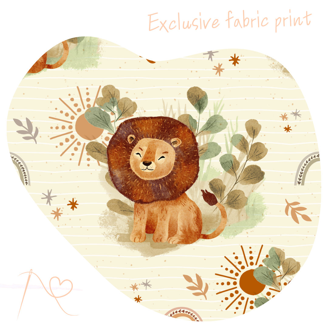 Leo the Lion sitting happy among the leaves with the sun shining and rainbows around on a lovely neutral colourway.