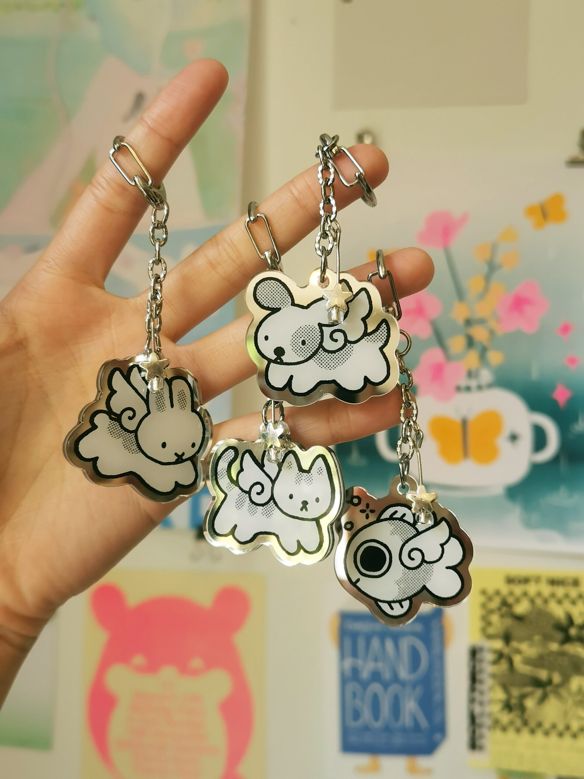All keychains feature double-sided mirror acrylic and a handmade beaded charm ~♡