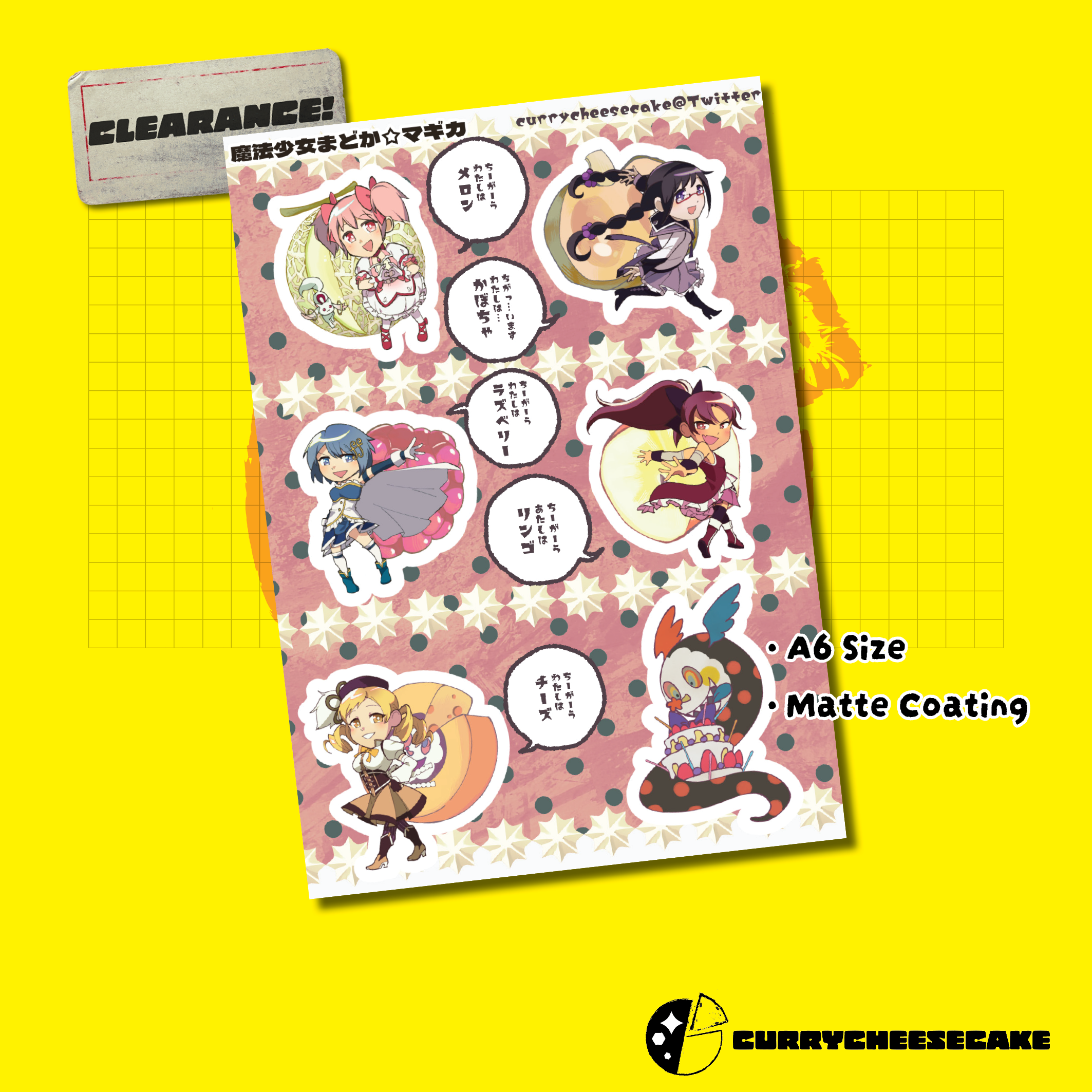 Inspired by the Cake Song from Puella Magic Madoka Magica: Rebellion, you can own a sticker of the Puella Magi Holy Quintet next to a tasty treat they are associated with in the song.