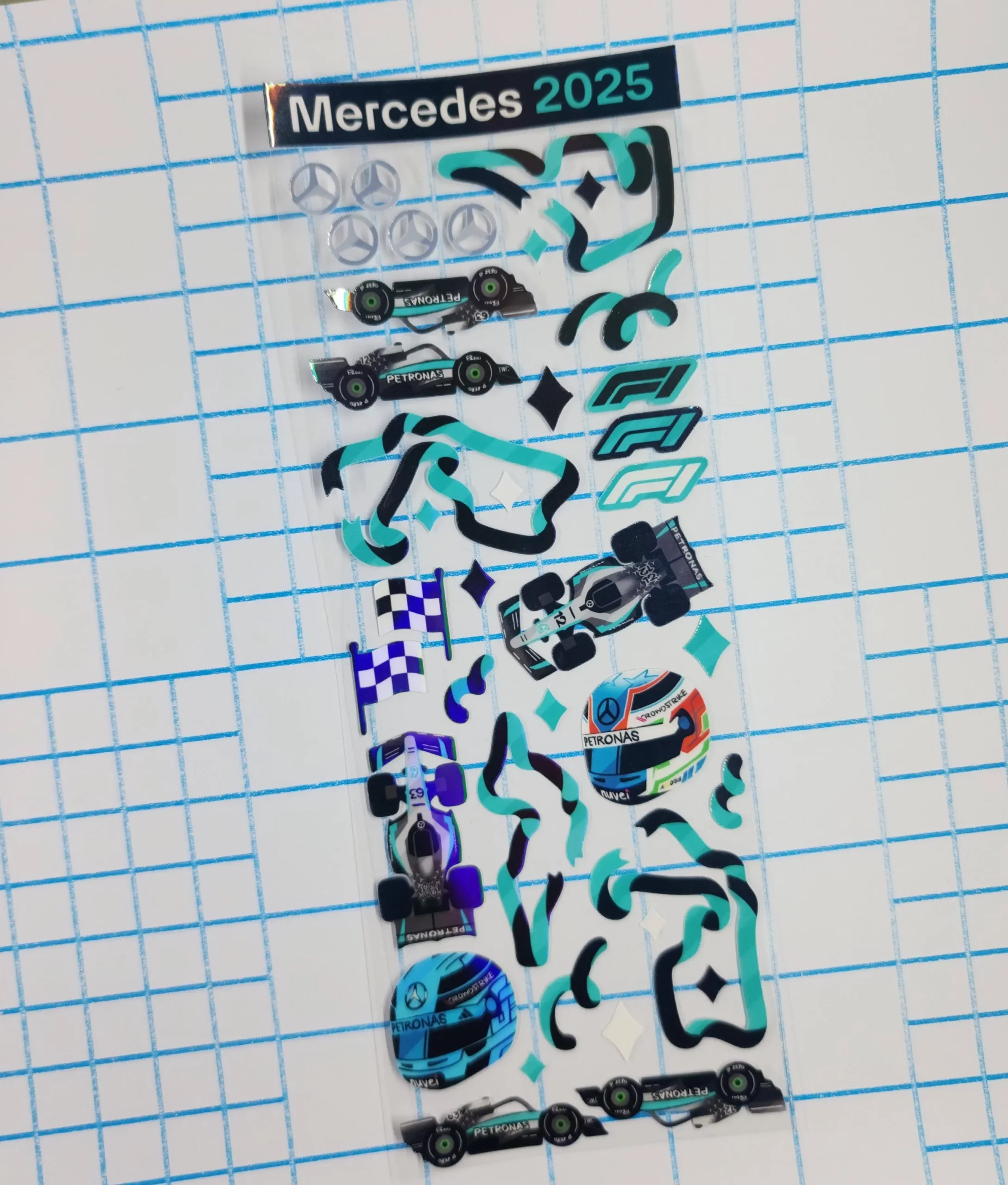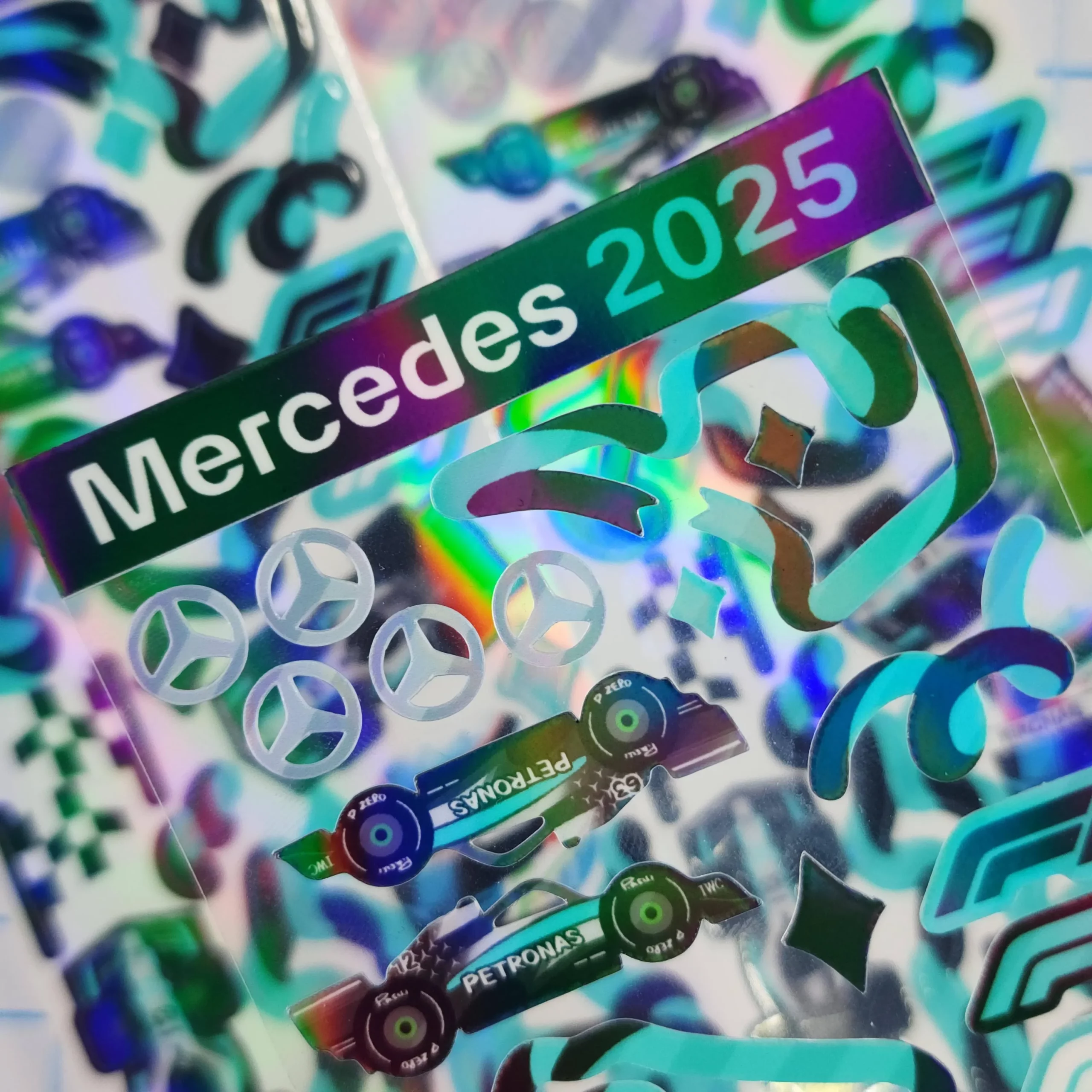 18cm waterproof deco sticker sheet with holographic laminate and clear backing, based on the Mercedes Formula 1 team!!