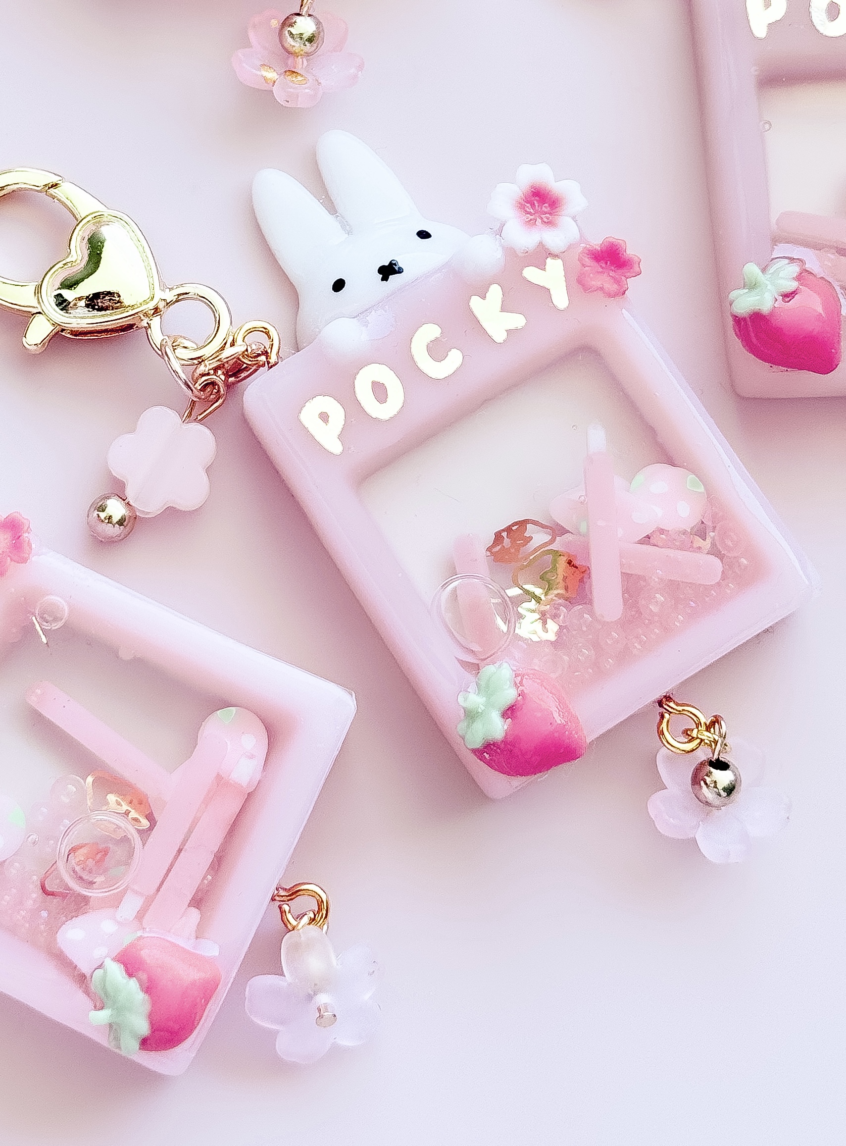 Handmade strawberry Miffy Pocky inspired resin shaker keyring