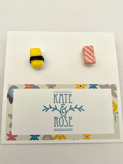 Egg and Salmon nigiri studs made in miniature from polymer clay and set onto surgical stainless steel studs