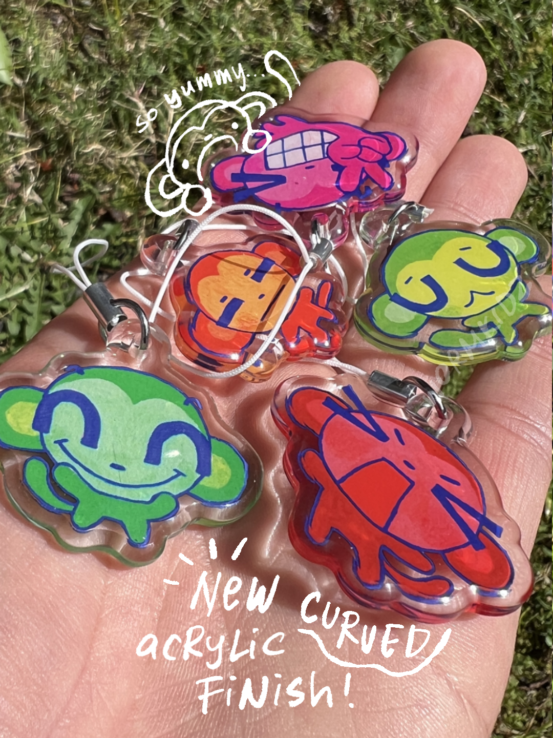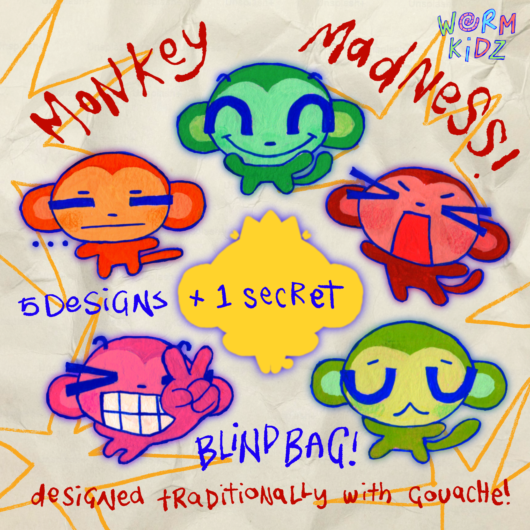 Each bag includes one 1.2 inch rounded acrylic charms of 5 different monkeys designs + one secret :000