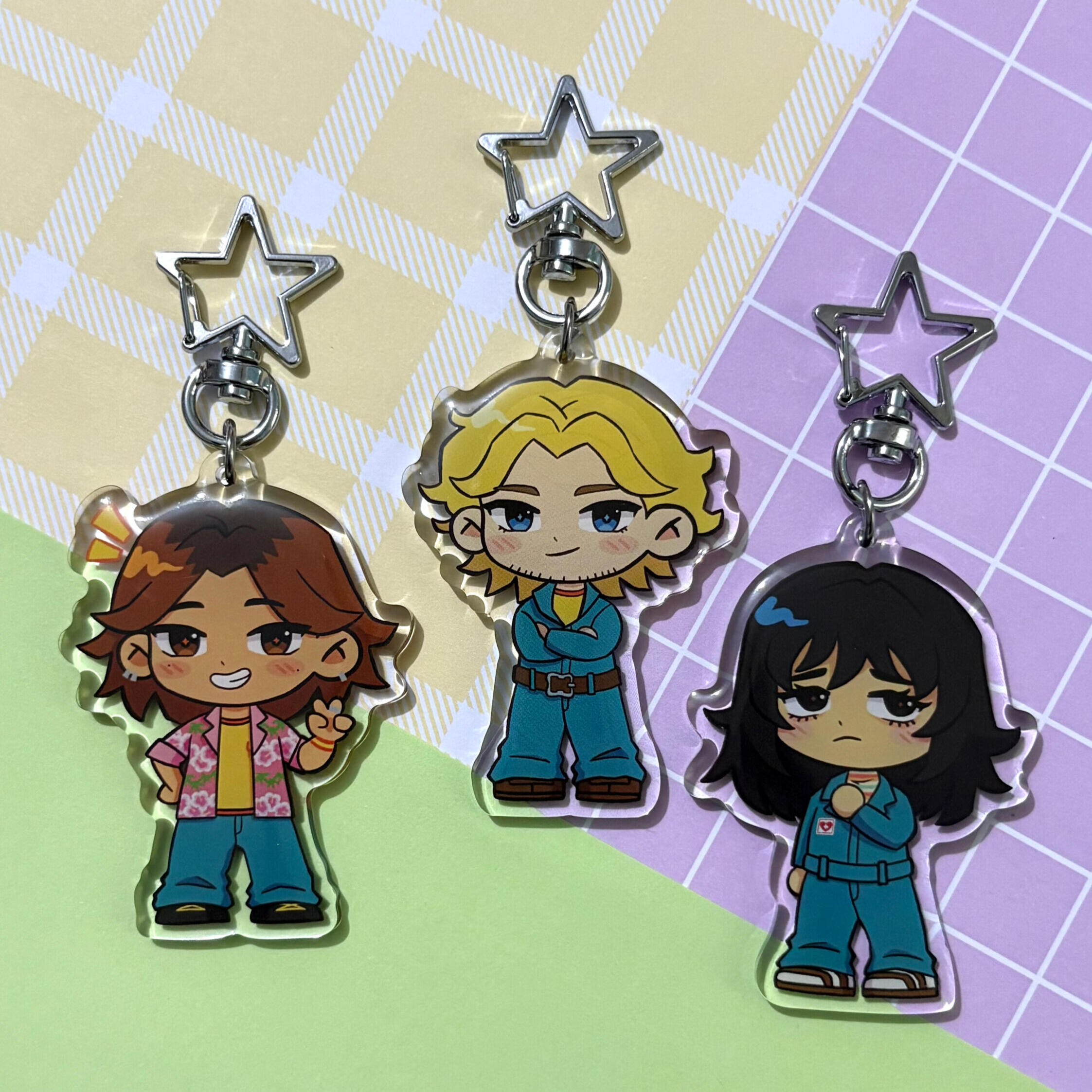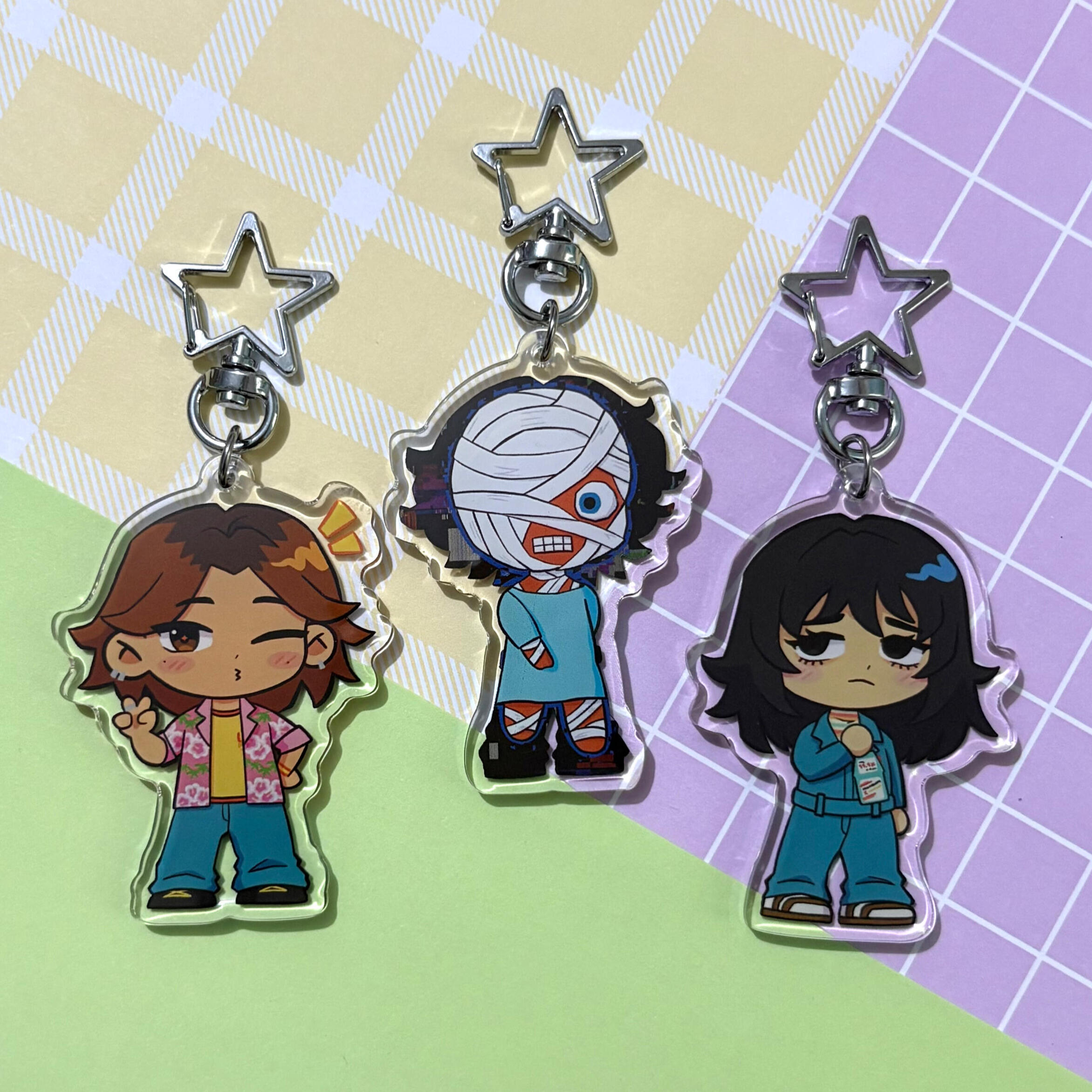 Keychains featuring Daisuke, Curly and Anya from the video game Mouthwashing!