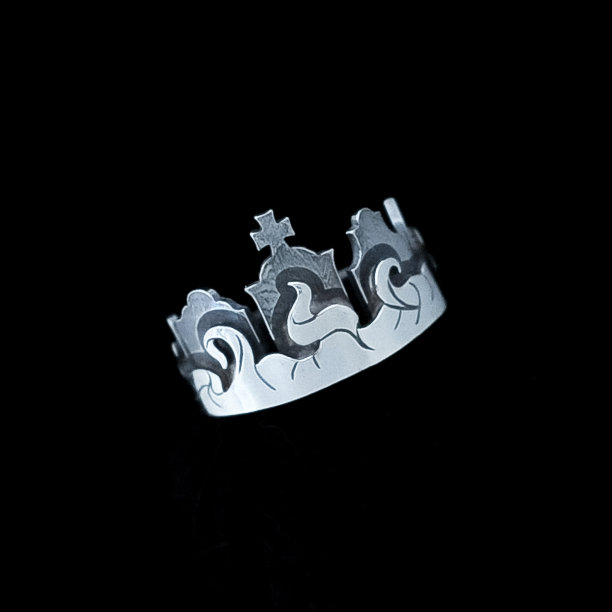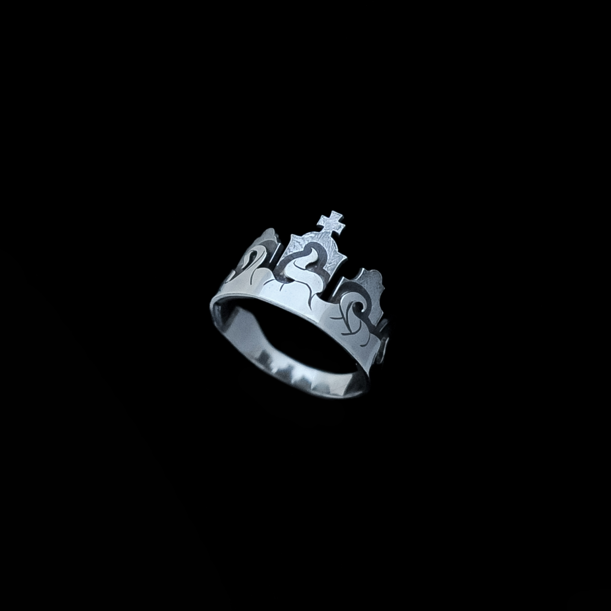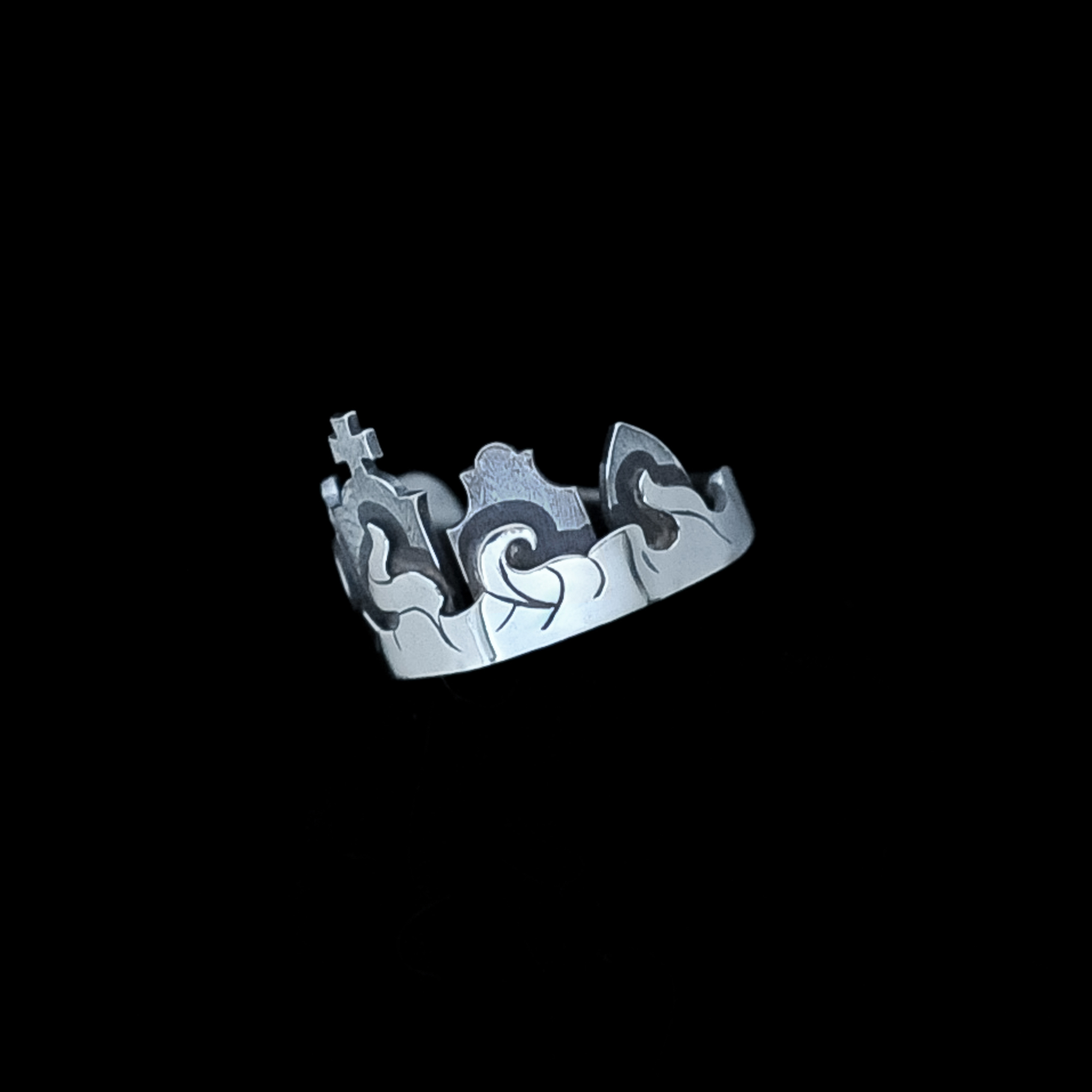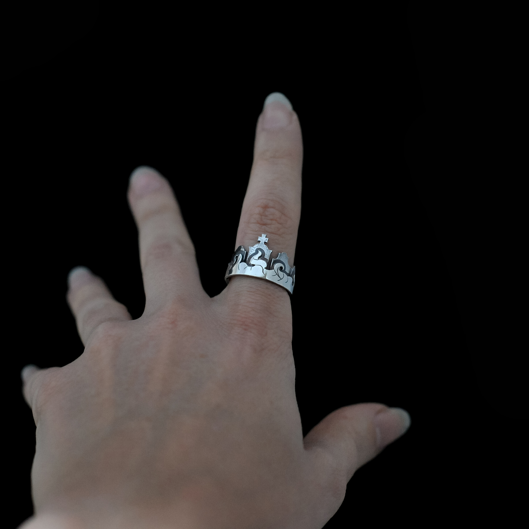 This supernatural cemetery ring features 5 unique Gothic tombstones which are oxidised for contrast against the bright silver of the mist band. Together they form a beautifully macabre little headstone crown for your finger.