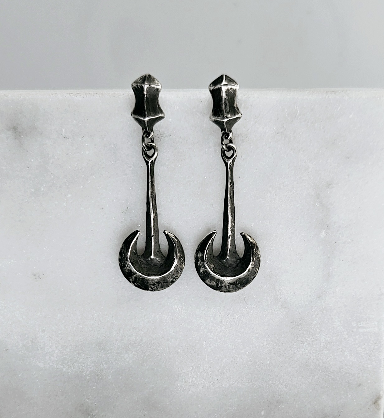 Oxidised Sterling Silver Scythe Earrings, 45mm total length.