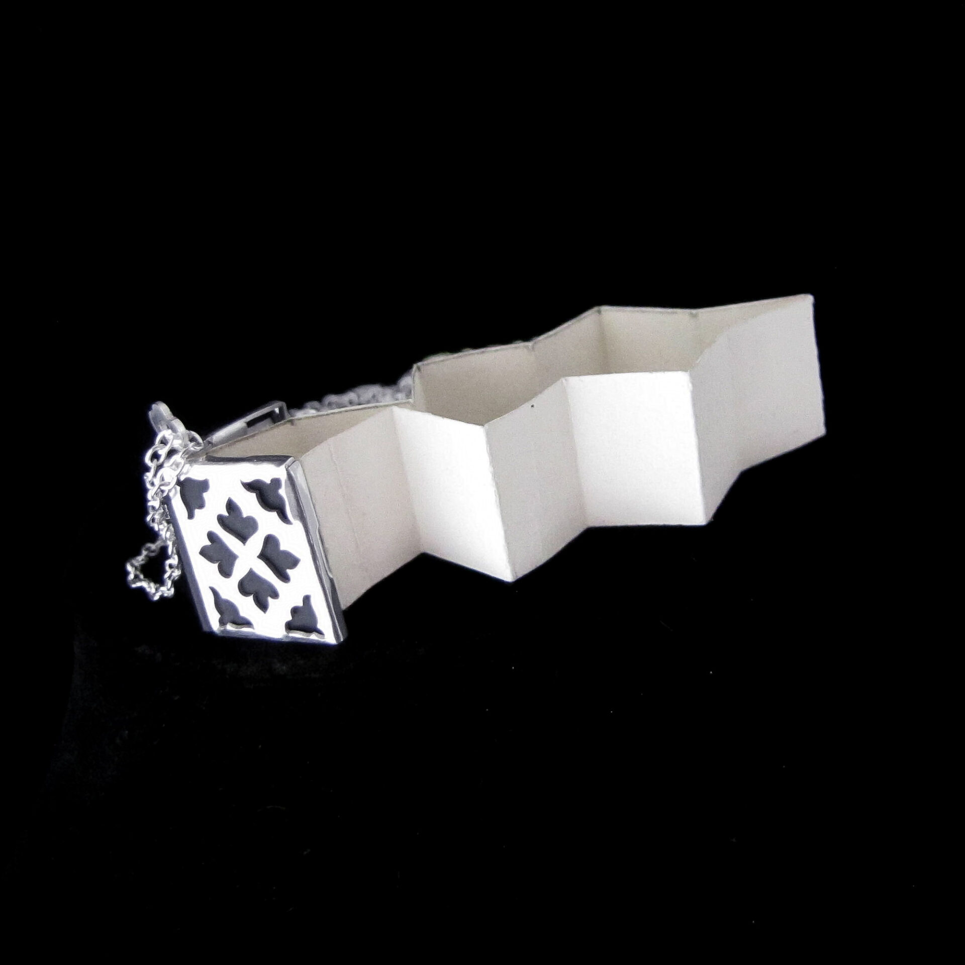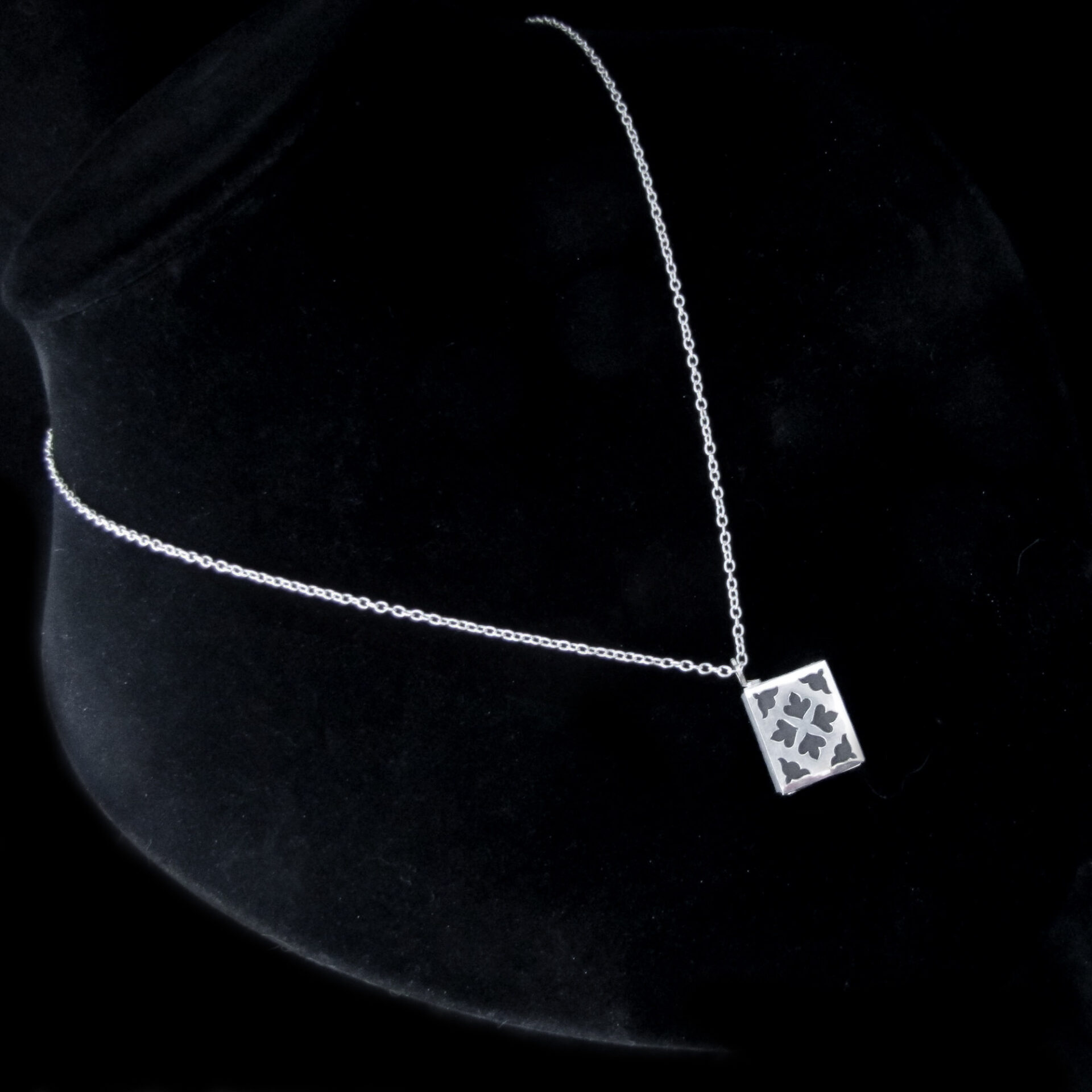 Hand pierced from sterling silver, the book pendant measures 1.6 x 1.3cm with a 45cm silver chain. The paper book insert is removable from the silver frame.