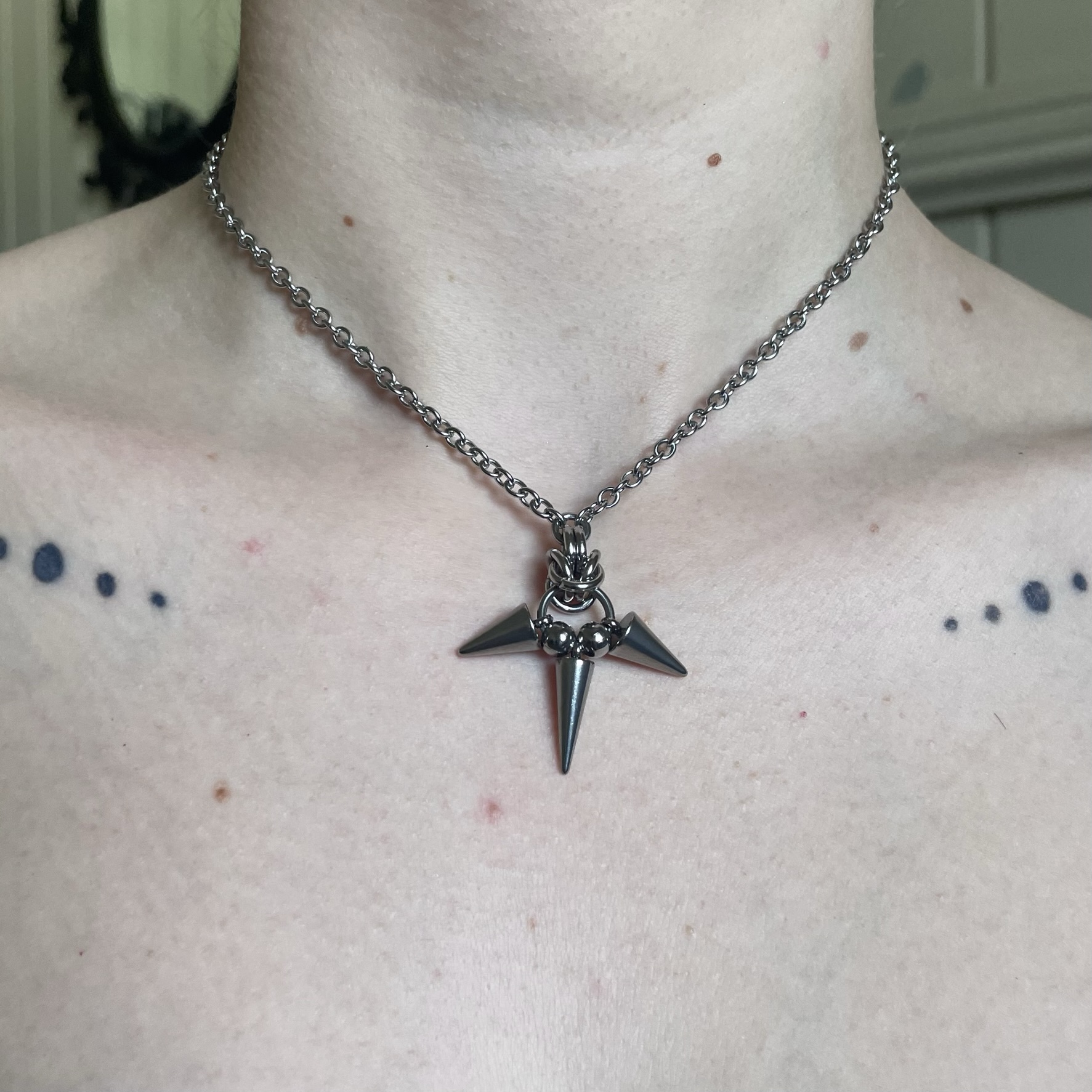 Handwoven stainless steel chainmail necklace adorned with spikes.
