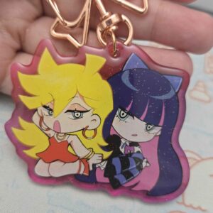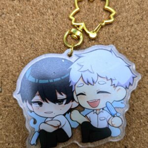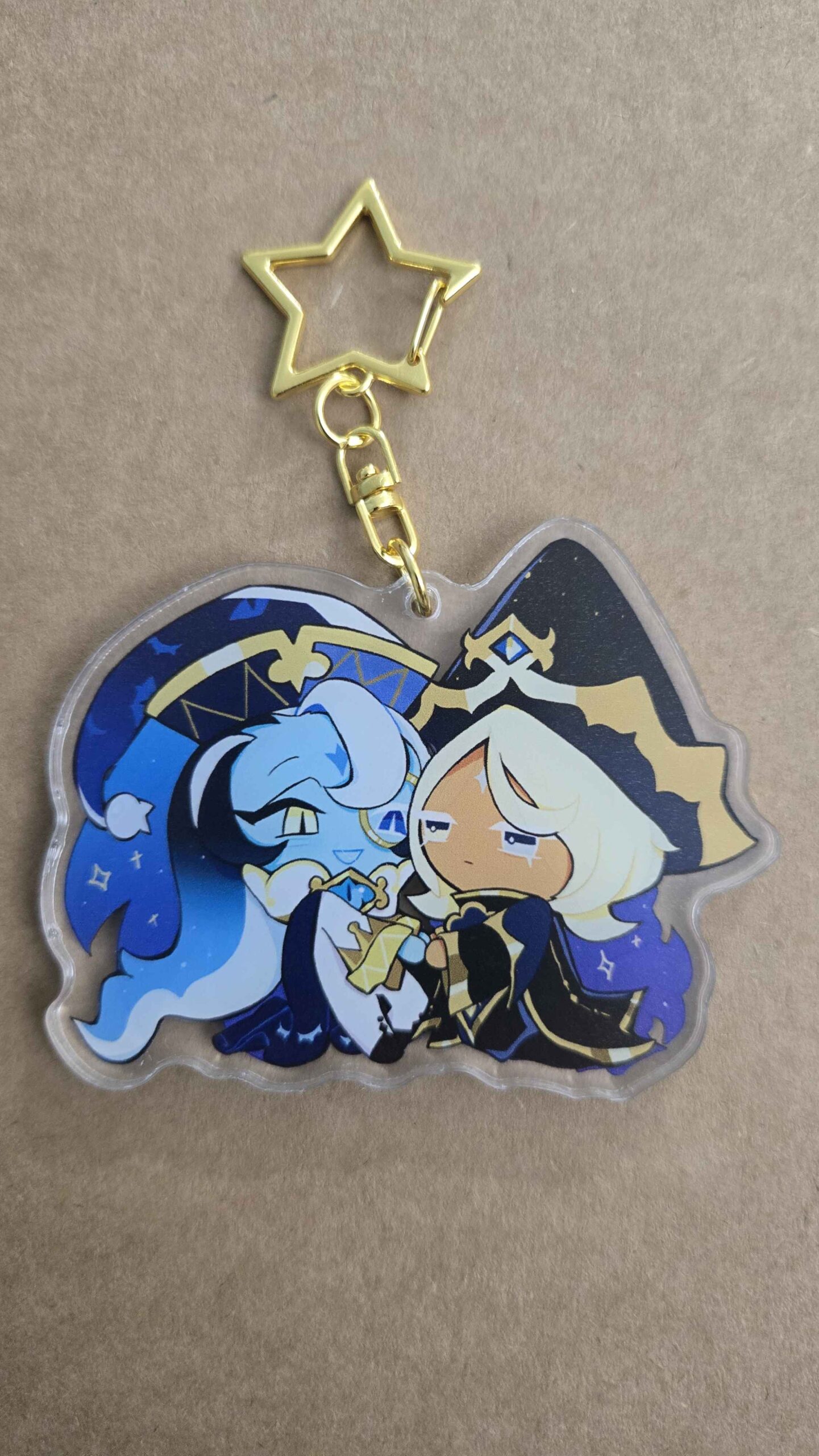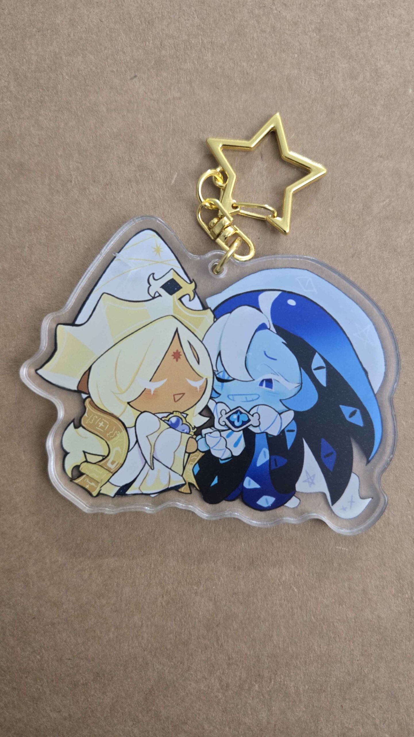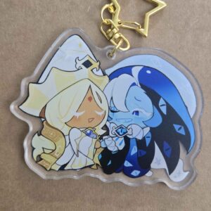 Fan-made keychain of Pure Vanilla Cookie and Shadow Milk Cookie from Cookie Run Kingdom/Devsisters, design drawn by viyuchii.