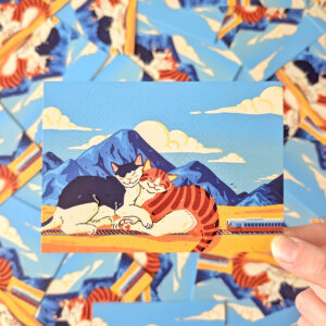 A waterproof vinyl sticker of a giant flame point cream cat enjoying a nap on a colourful rooftop.