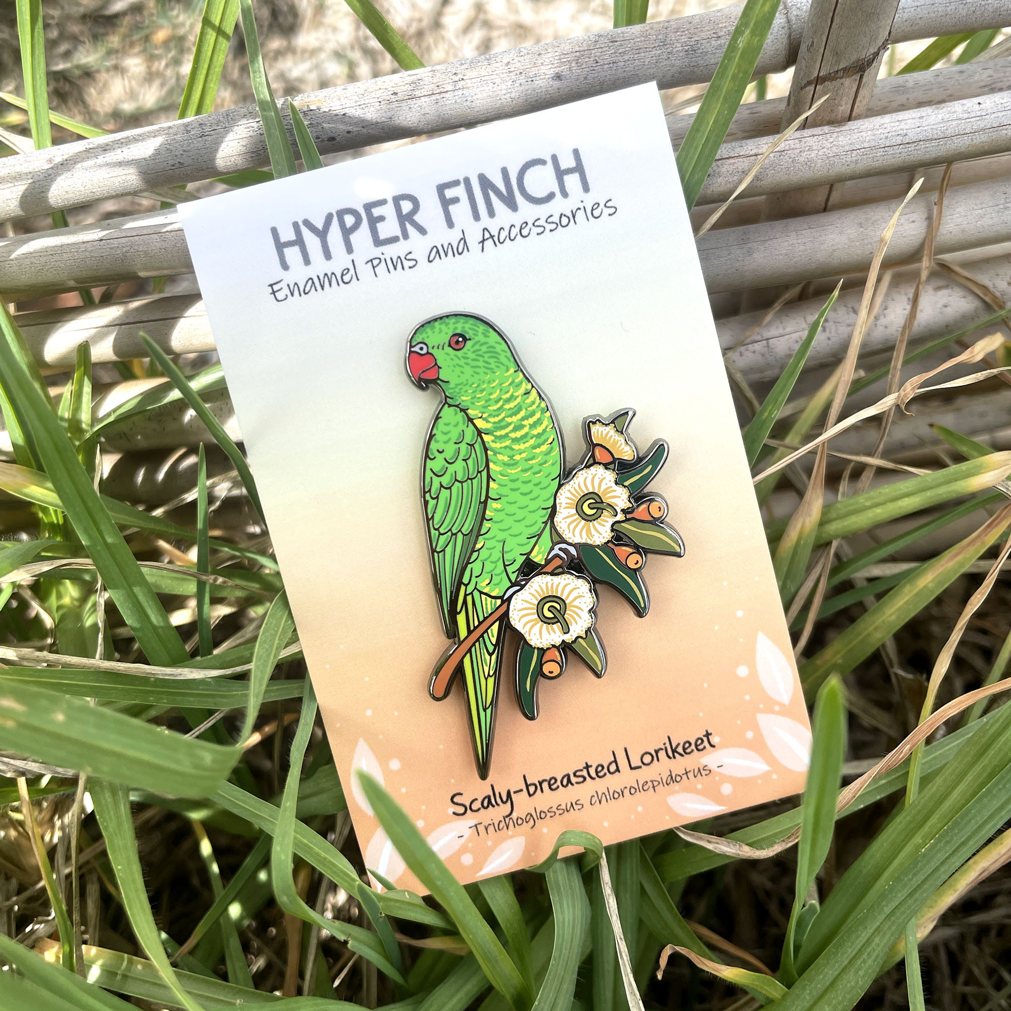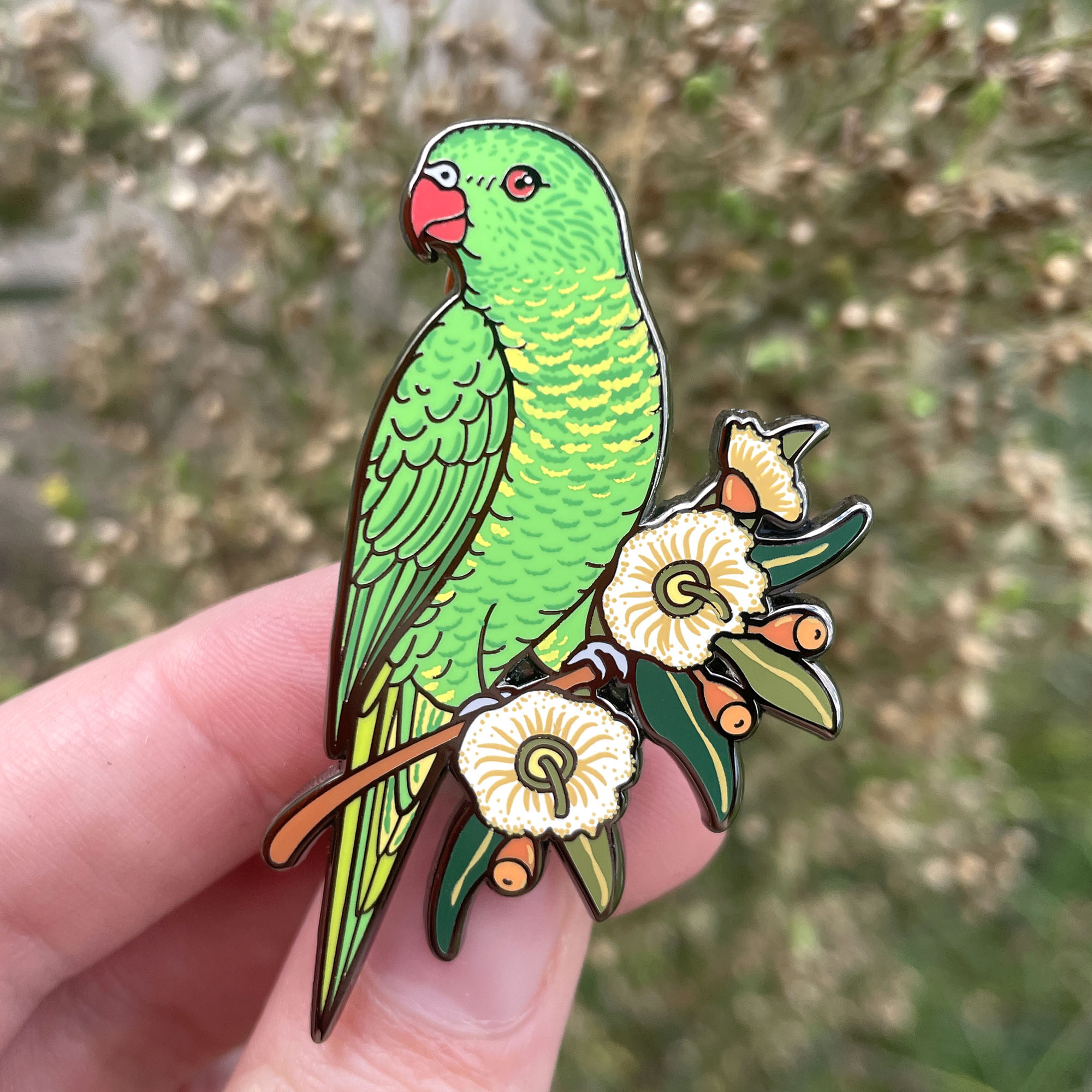 Scaly-breasted Lorikeet Enamel Pin perched on white gum blossoms. measures 51mm in length and features two pin posts with metal butterfly clutches.