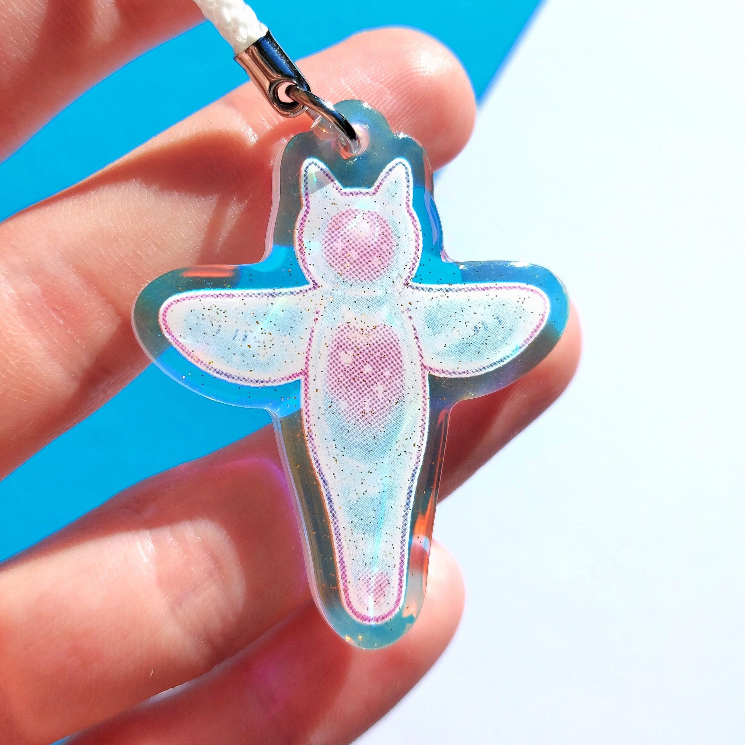 ✿ Each phone charm features a glittery epoxy on the front, with a gorgeous rainbow acrylic outline that shimmers and changes colour in the light