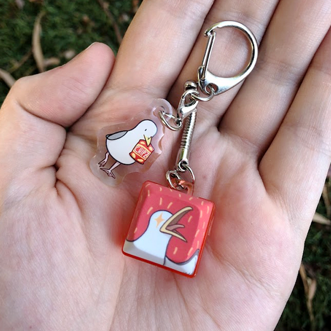 This clicky charm features 1 seagull themed keyboard clicky cap, and 1 seagull clip on accessory. Each cap is compatible with mechanical keyboards!