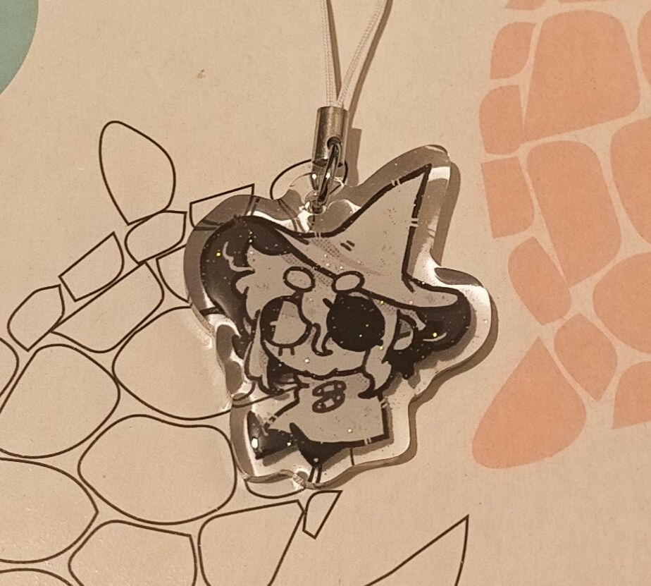 1.5 frontside glitter epoxy phone charm of Siffrin from In Stars and Time by Insertdic5. Sides are differing, and comes with a star attachment and a white phone cord.