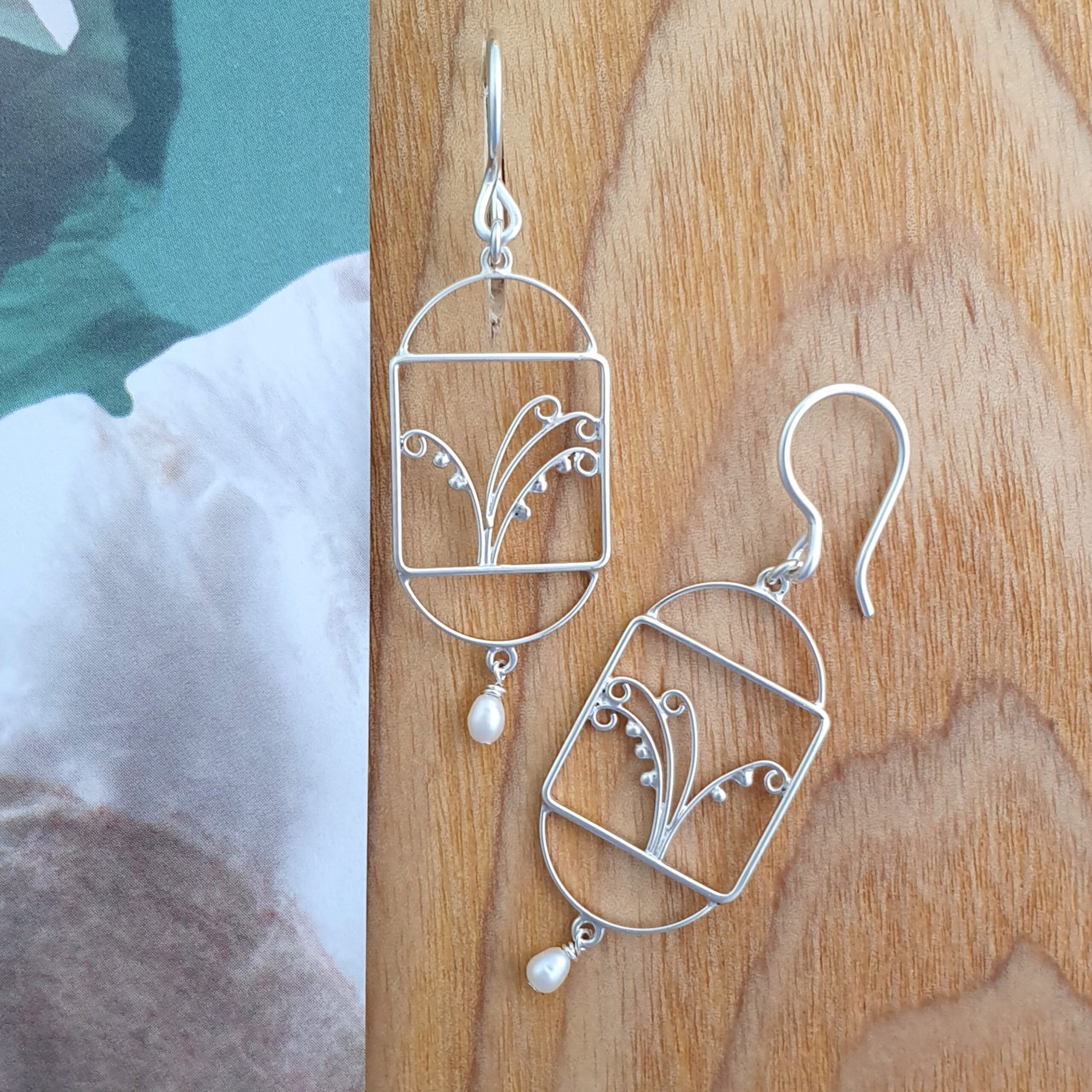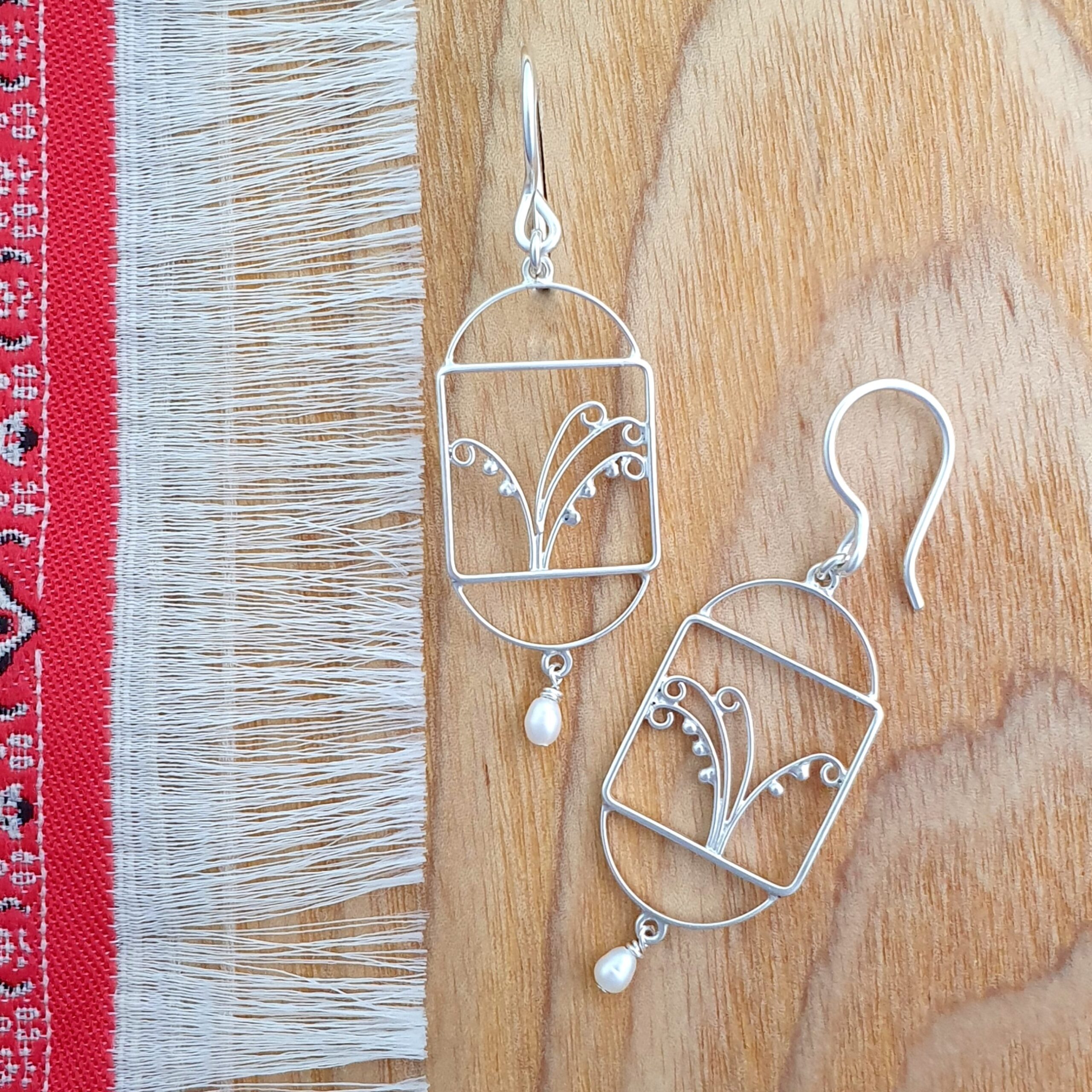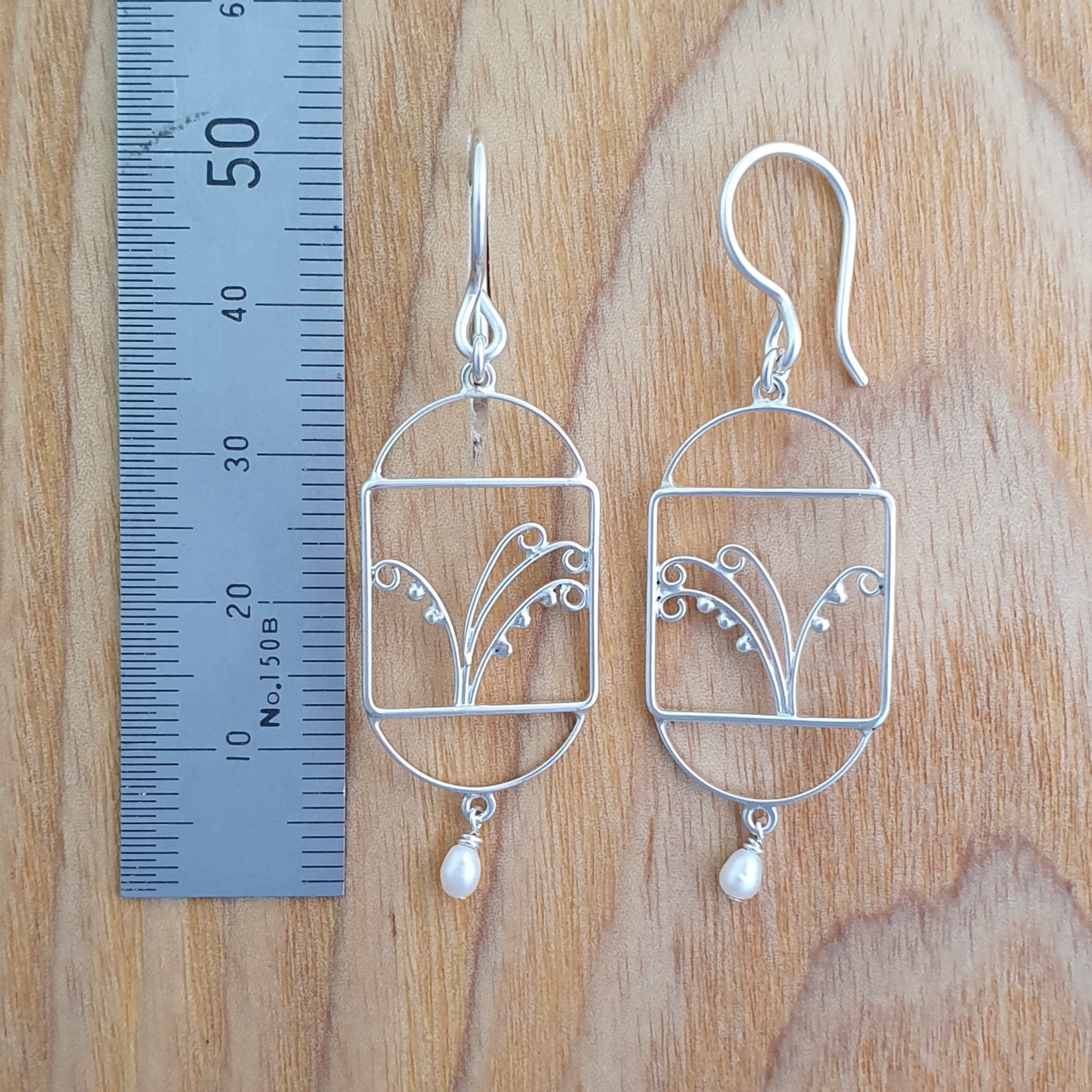 Snowdrop inspired earrings made from sterling silver wirework with tiny freshwater pearls drops. Pearl 3x2mm. Length from top of hook 50 x width 15mm. SW1448