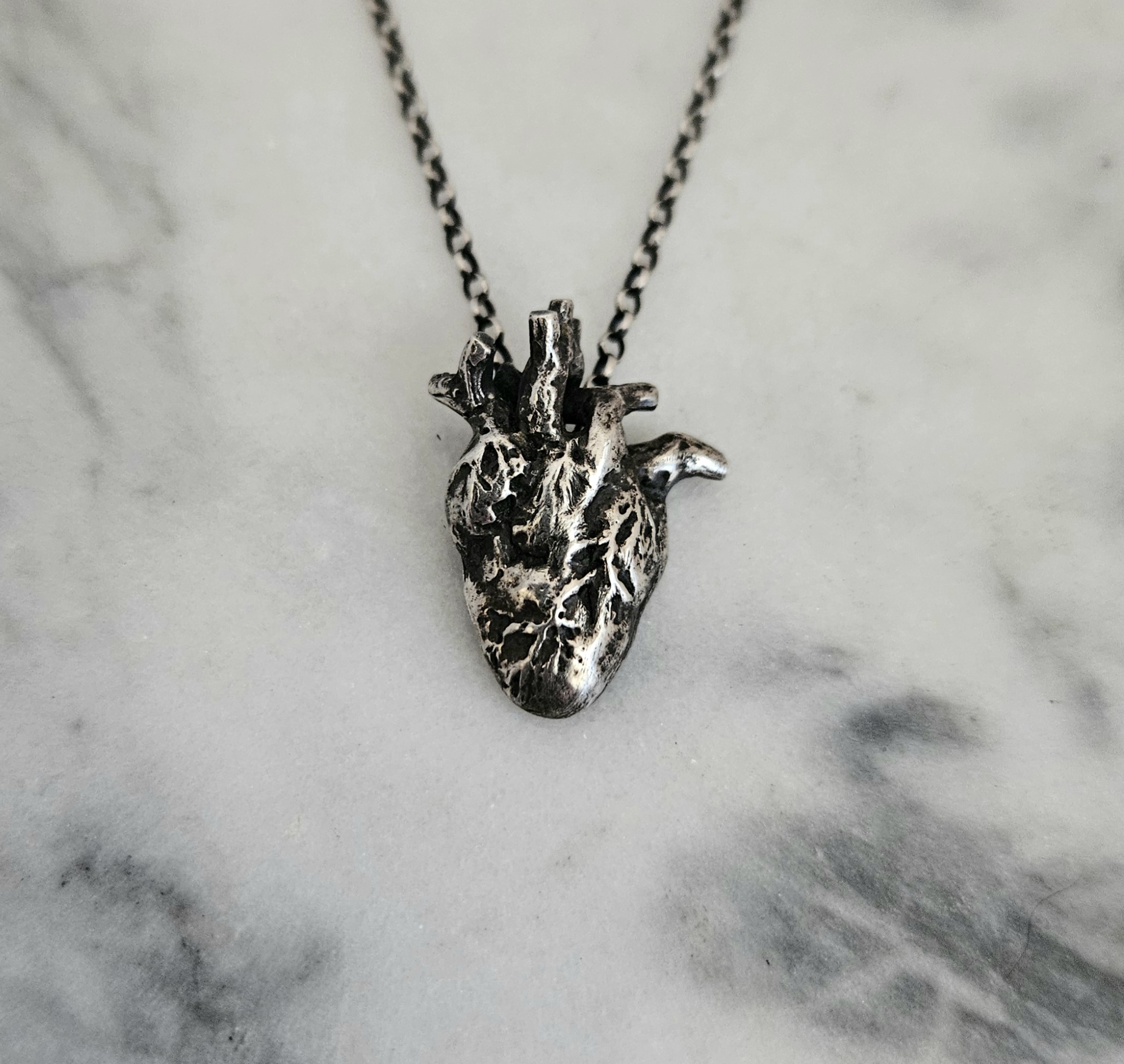 Oxidised Sterling Silver Anatomical Heart Pendant on Belcher Chain. The pendant is 22mm in length.