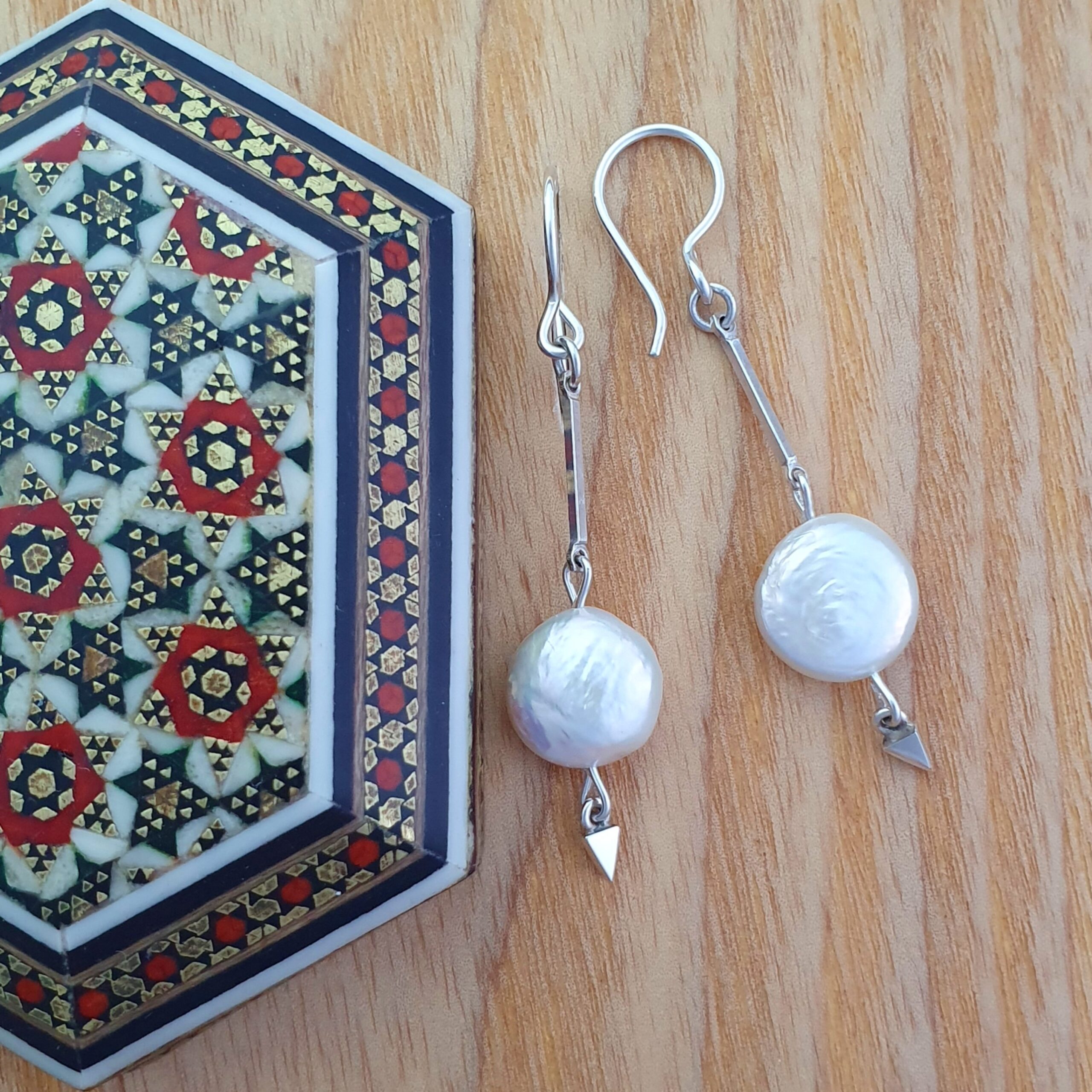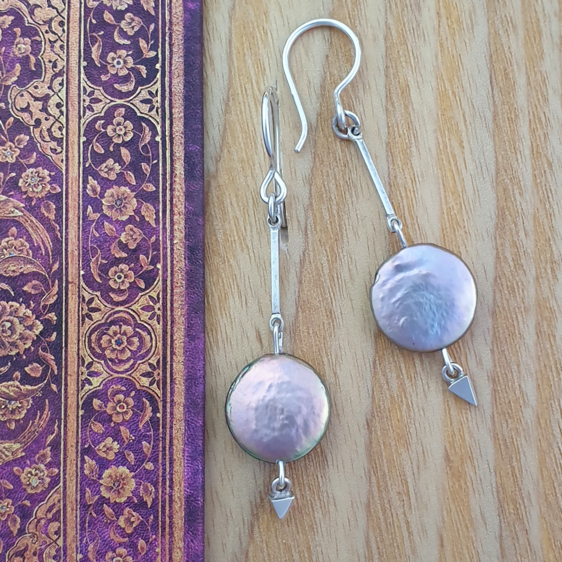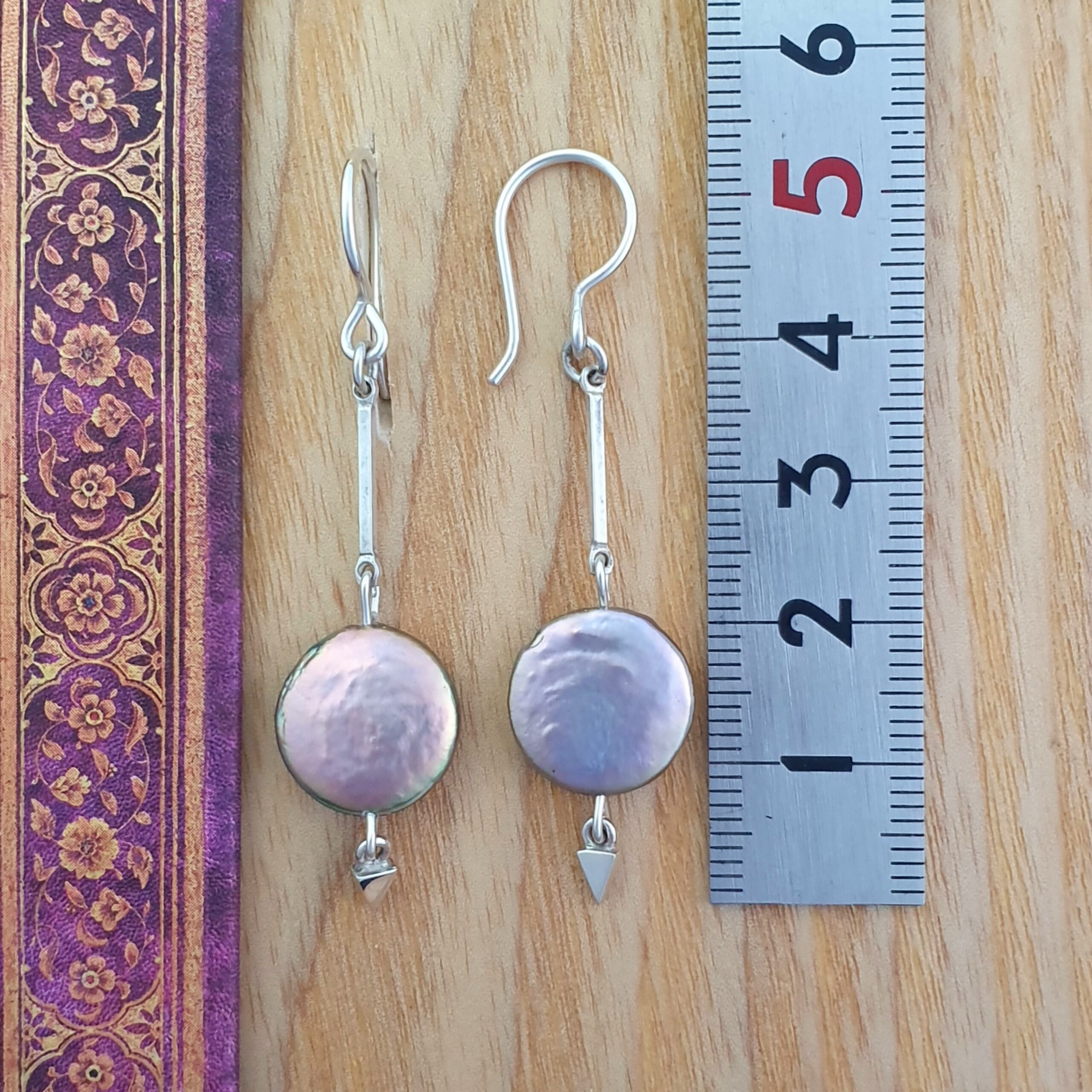Mauve, freshwater coin pearl earrings with square stems and triangular drop, handmade by Flying Lobster Jewellery. Also available with a white pearl. Coin pearl 14mm. Length from top of earhook 53 x wdith 14mm. SW1479P